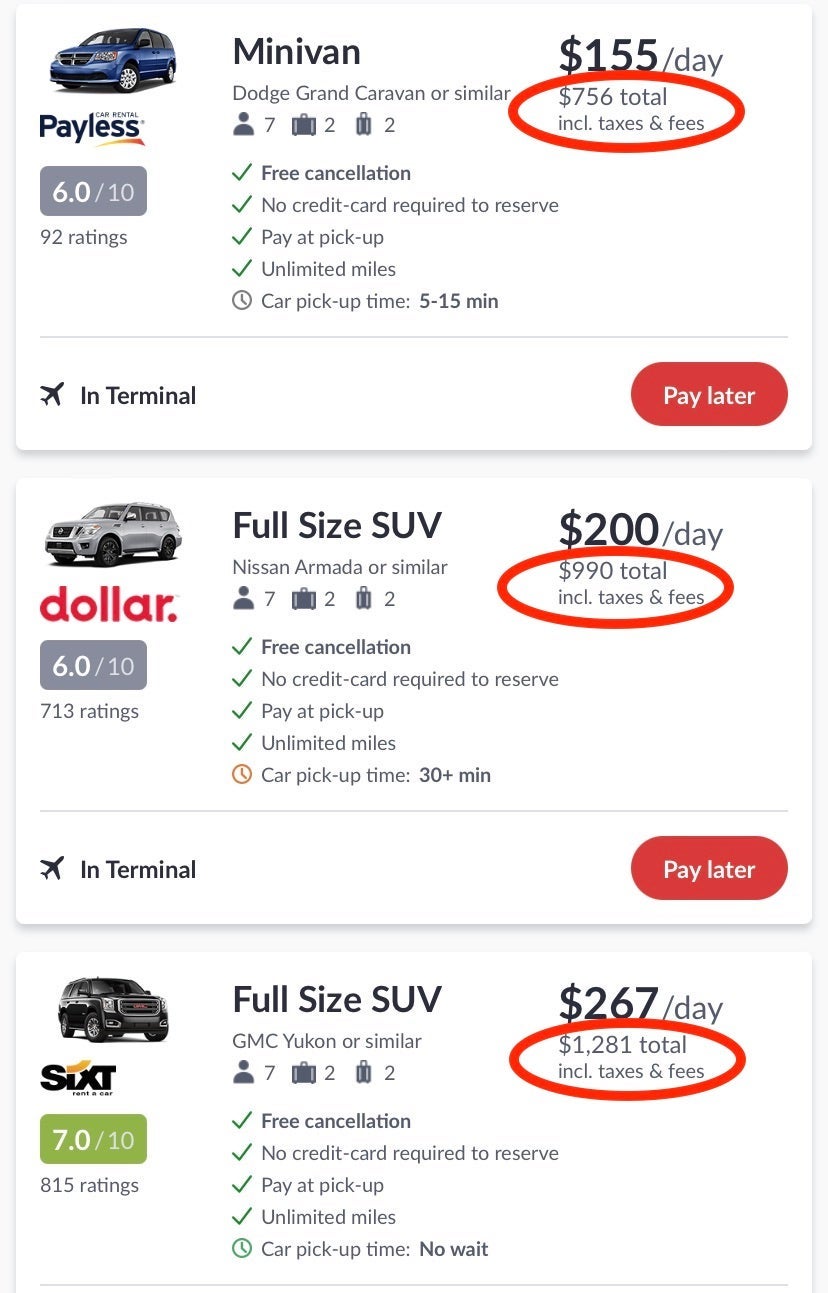 For this trip, I needed transportation that could comfortably handle eight riders. Luggage wasn't an issue since all of us (except for my kid) had Spirit-friendly underseat bags or small carry-ons. Unfortunately, not only did Hotwire lack inventory for eight-person cars, but the site's rates were also shockingly high.