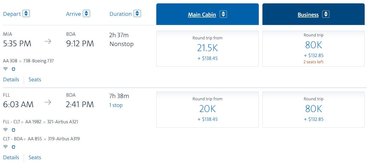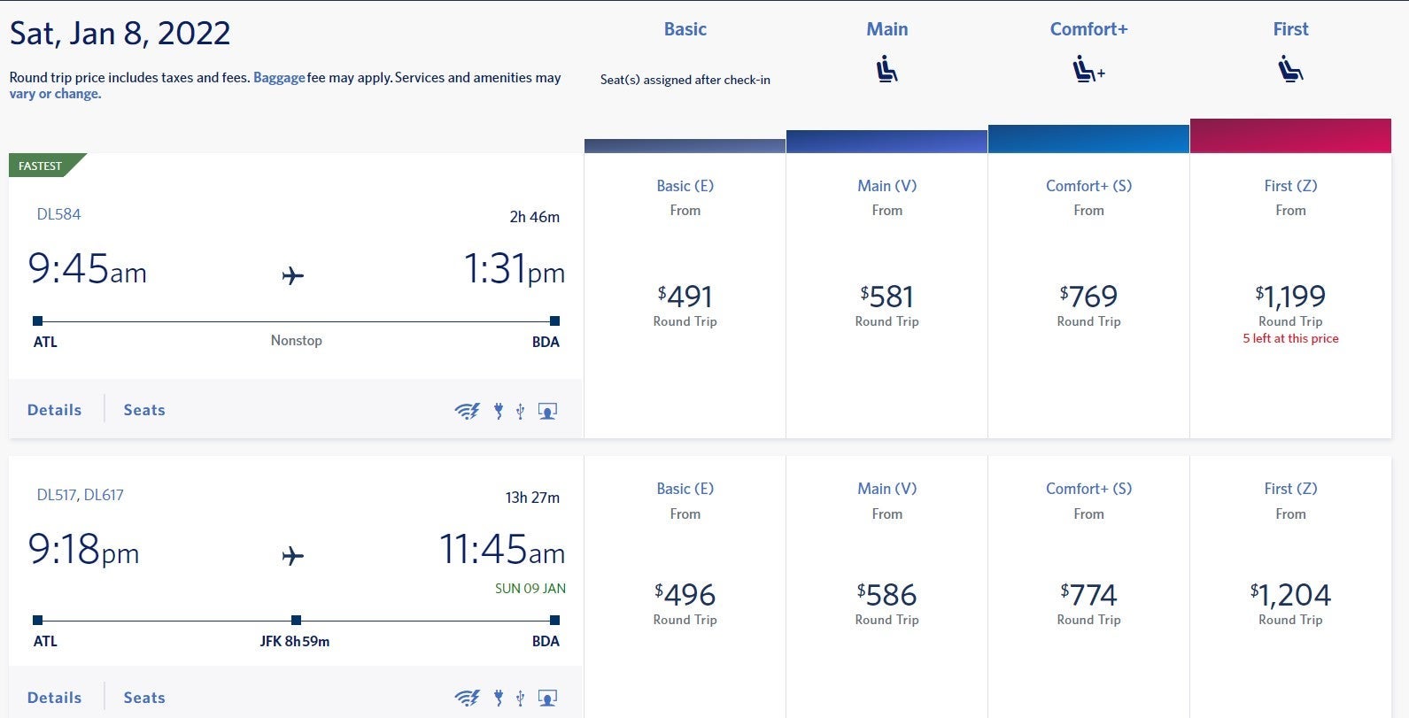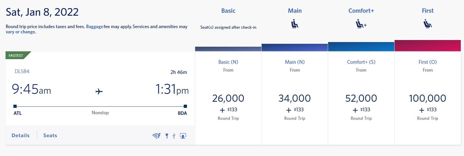 Delta offers nonstop flights from Atlanta (ATL) to BDA. In mid-January, round-trip tickets start at $491 or 26,000 points (+133) for basic economy; $581 or 34,000 points (+133) for main cabin; $769 or 52,000 points (+133) for Delta Comfort+ and $1,199 or 100,000 points (+133) for first-class seats.