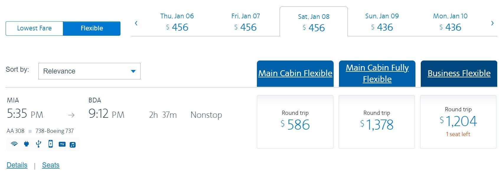 Nonstop American Airlines flights in January from Miami (MIA) are available starting at $586 or 20,000 points (+138.45) round-trip for main cabin flexible seats. Business class seats cost $1,204 or 80,000 points (+132.85) round-trip.