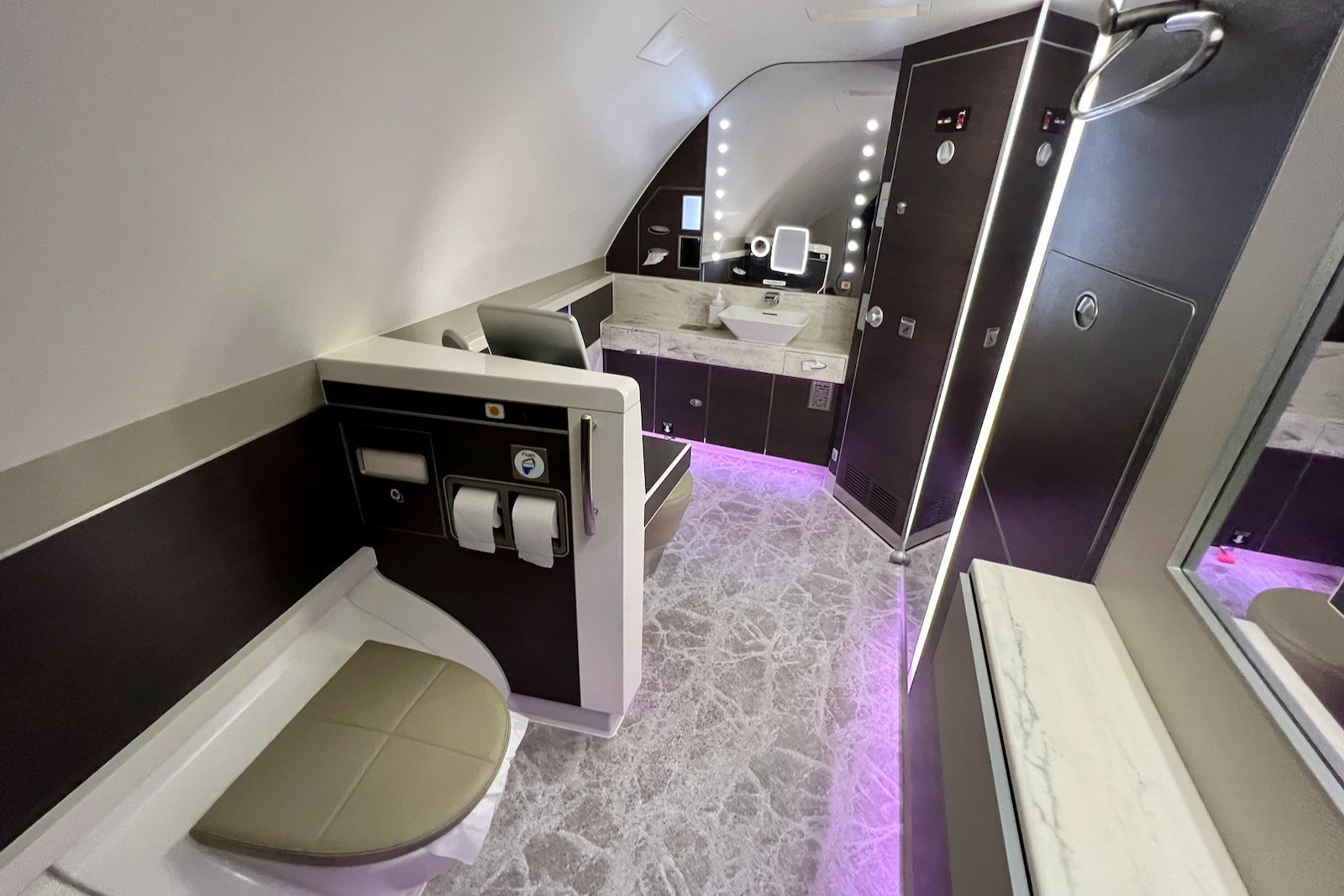 Each suite features doors for additional privacy, and there are two snazzy lavatories at the front of the plane with makeup mirrors and fancy finishes.