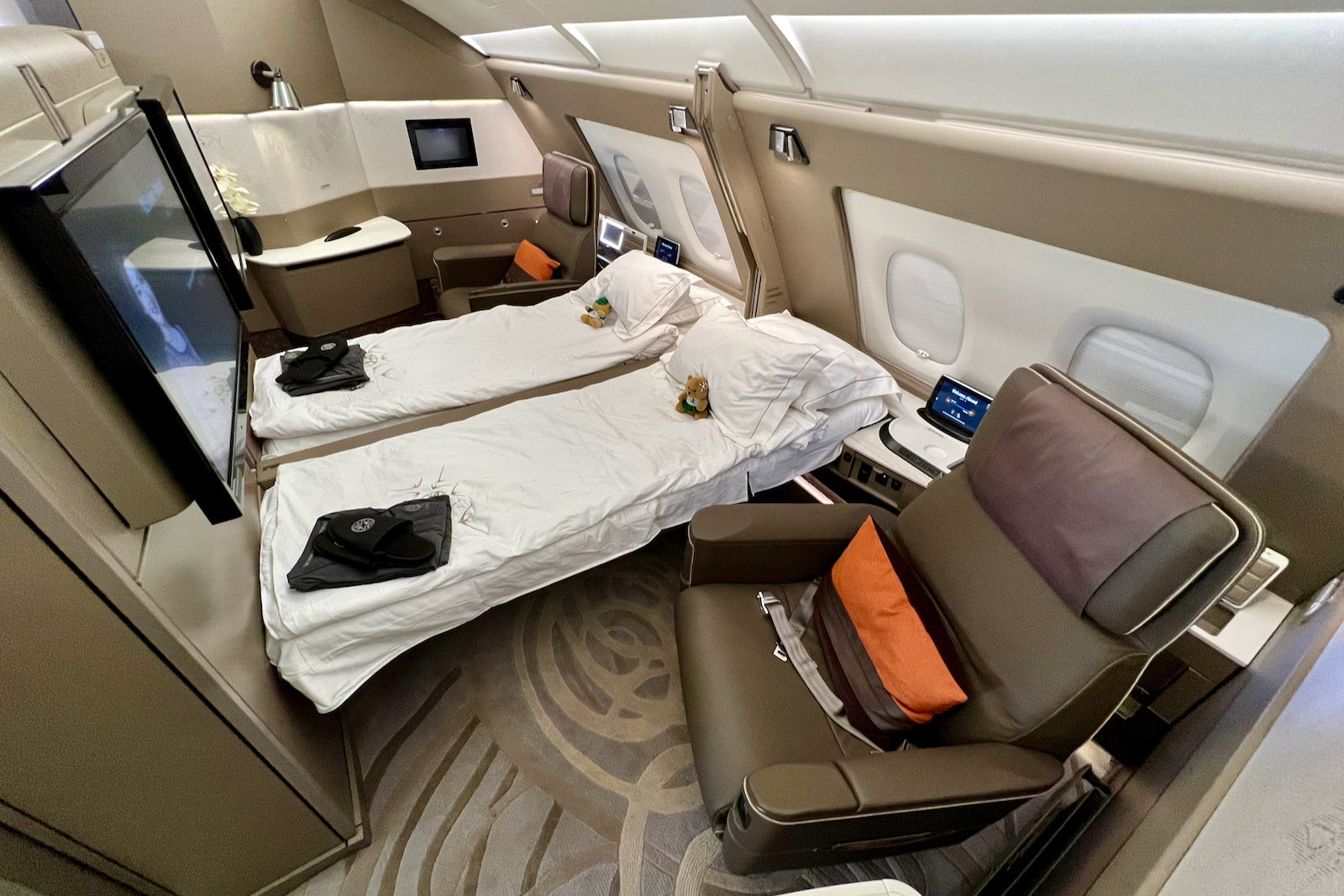 Singapore Airlines' Airbus A380s feature just six first-class seats on the upper deck of this whale jet. Arranged in a 1-1 configuration, these suites offer an unrivaled amount of personal space — much more than many New York City studio apartments!