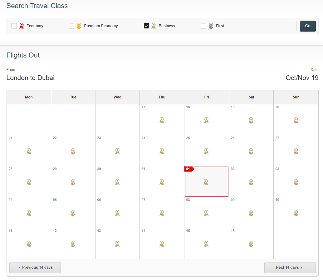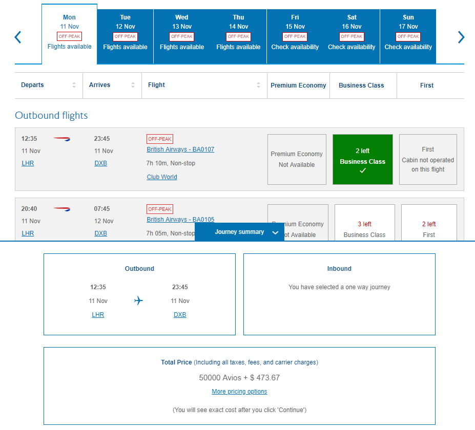 Just a warning that you're going to get a lot of false positives when looking for British Airways business class flights between London and Dubai since Qantas is also partners with Emirates. So, you might want to skip this method for Dubai flights: