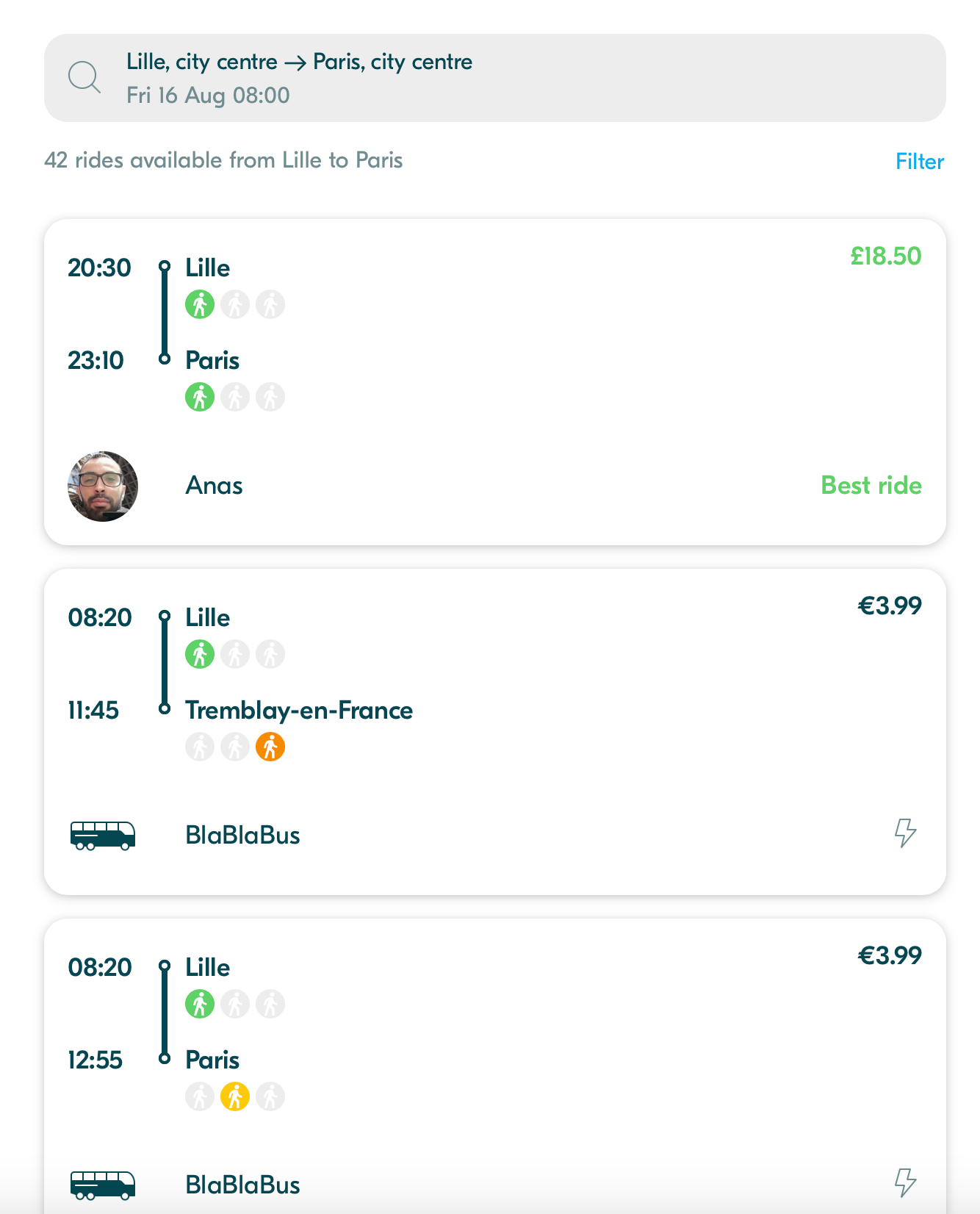 But the prices are definitely the highlight. For instance, a trip from Lille, France, to Paris ranges in price from $3 (£2.39) to $22 (£19.99). When looking at BlaBlaBus, the option to book a bus will appear on the homepage of the site. From there, you can search various routes that you're considering. The results will show both bus and carpool options, so you can sort through them and decide the best offer for you.