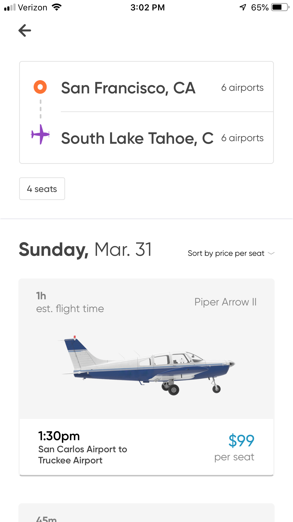 Below is an example of flights for as little as $99 one-way on BlackBird between San Francisco and the Lake Tahoe area: