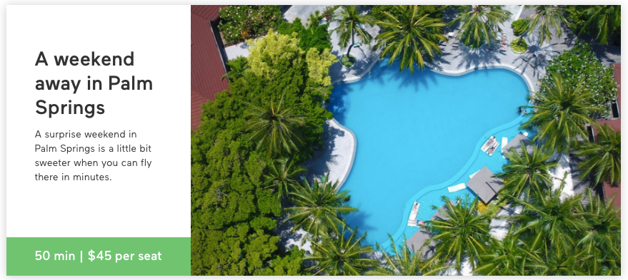 The home screen of the flyshare app shows flight options with seat prices. If users don't see what they need or the flights don't fit their schedule, they can create their own flight. The site is currently advertising sample flights from Los Angeles to Palm Springs for as low as $45.