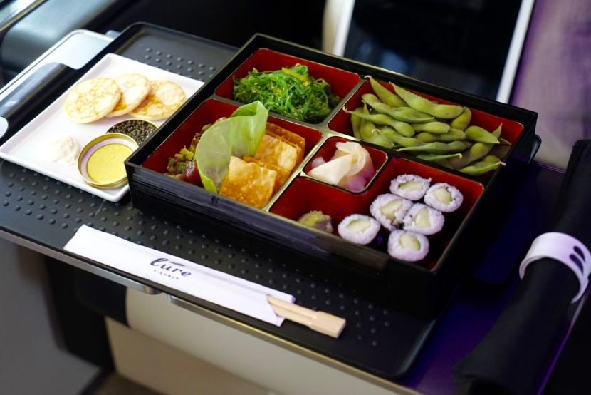 Gourmet food is provided by hand-picked executive chefs, and yesterday's inaugural flight was catered by Lure Fishbar. A bento box full of Japanese cuisine was served for dinner, complete with a side of caviar.