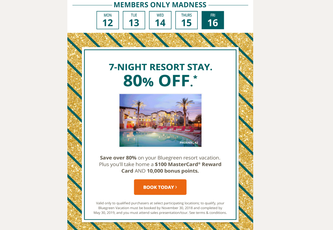 The pre-Black Friday offer was for seven nights at a Bluegreen Vacations property for $499. The offer clearly stated that both me and my spouse would have to attend a two-hour sales presentation in order to get that rate.