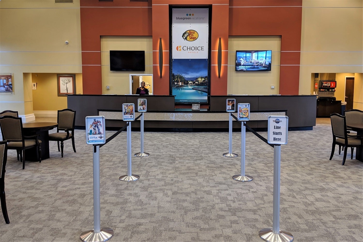When we arrived for our stay at The Fountains, we were directed to check in at the Welcome Center after the 4pm check-in time, but before it closed at 9:30pm. No early check-in, late check-out or other benefits of being a Choice elite would be honored by Bluegreen. When we arrived just after 5pm, the grand Welcome Center was empty, before an agent emerged from the back office.