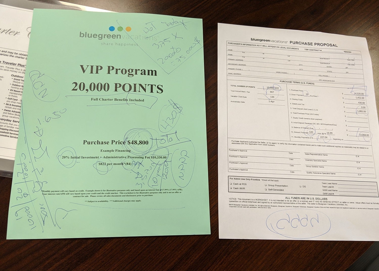 Our salesperson returned with just one offer at the 20,000 points per year level. The top line price: $48,800. That equates to 2.44 dollars per point, per year, compared to what the salesperson said is the standard price of 3.75 dollars per point, per year. This offer added another $570 of closing costs to finance the purchase and required 20% down. The interest rate for the example was 17.99%.