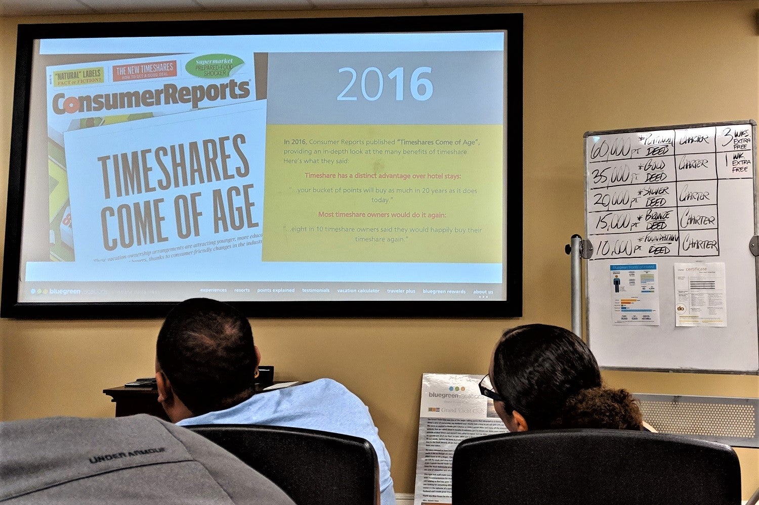 The presentation also referenced a Consumer Reports feature about timeshares claiming Consumer Reports said, "Your bucket of points will buy as much in 20 years as it does today," and that, "Eight in 10 timeshare owners said they would happily buy their timeshare again."