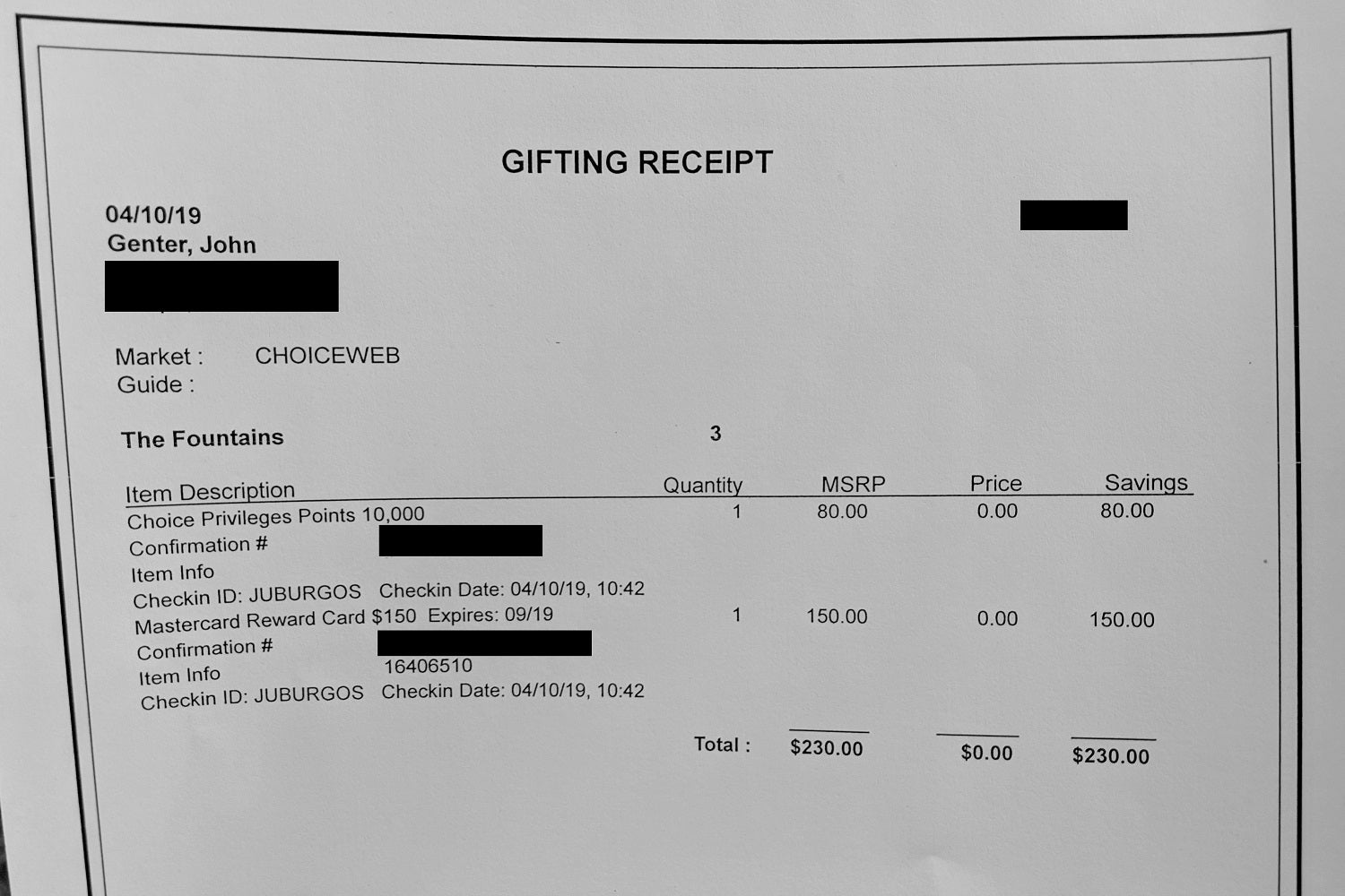 Upon arrival, we were reminded yet again about the terms of the package and had to sign a Guest Registration Form that noted the increased $150 MasterCard gift and 10,000 Choice points. In addition to our names and addresses, we needed to list: