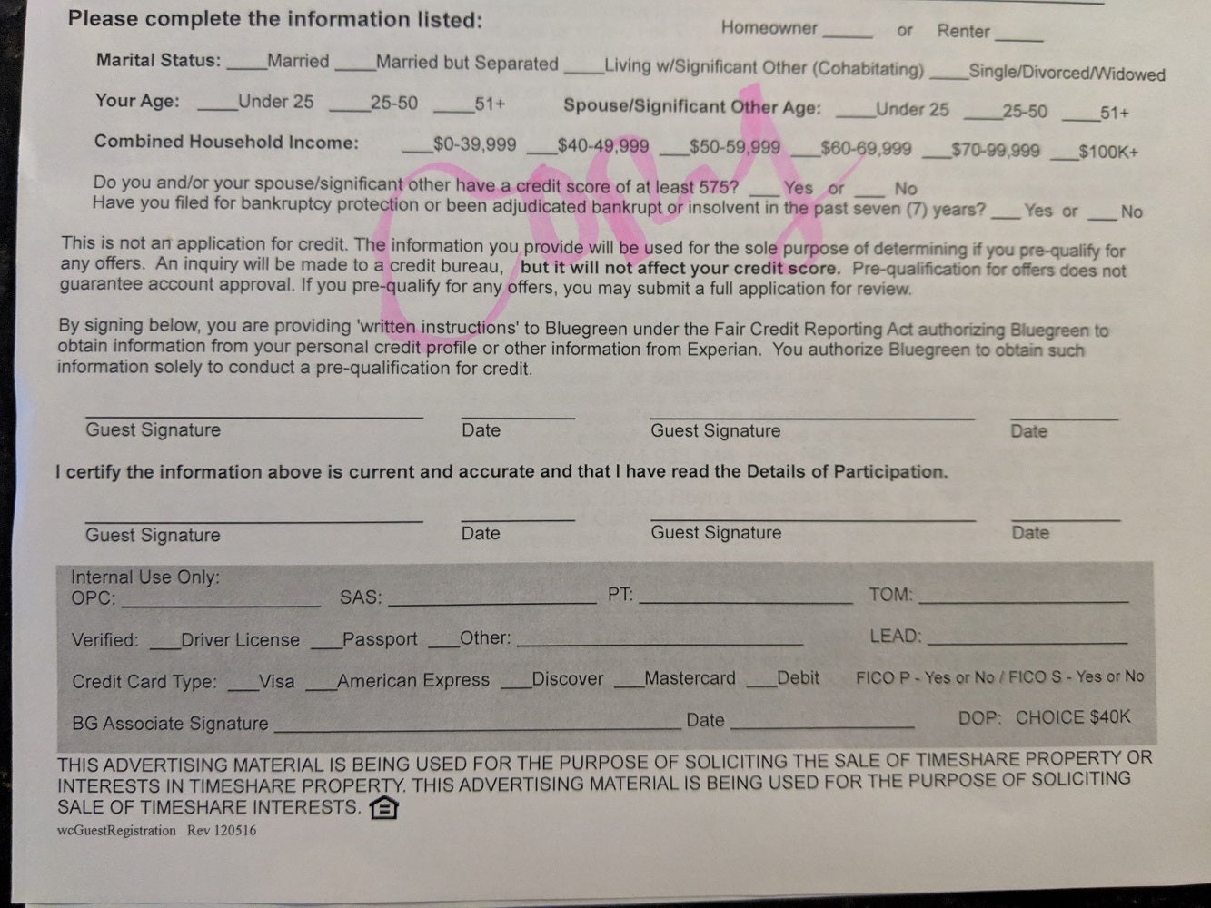 At the bottom of the form, the disclosure makes it abundantly clear that, "This advertising material is being used for the purpose of soliciting the sale of timeshare property or interests in timeshare property."