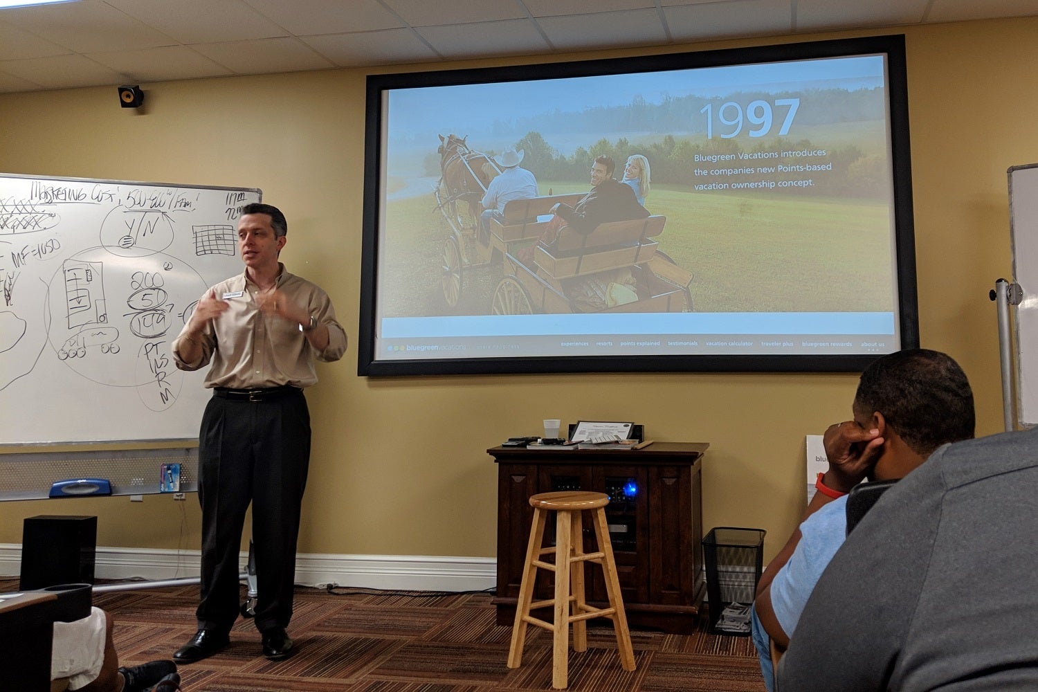 He also landed some stinging jabs, saying we were all too cheap to pay for a full-priced vacation and how romantic this must be for the wives in the room. Elliott also peppered in some interesting stats, like how we were in the largest sales center of all 69 Bluegreen properties.
