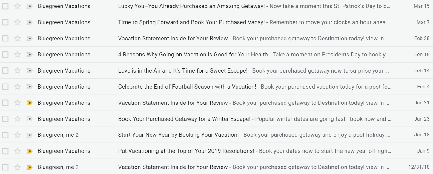It wasn't until a full month after the purchase I received a confirmation that unleashed the emails from Bluegreen Vacations reminding me to book our nights: