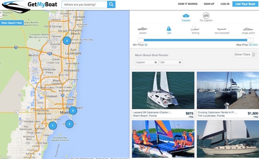 I took GetMyBoat for a test spin by searching for Miami-area sailing charters with a captain and found 20 options, including a good-looking 40-foot sloop that was docked in Coconut Grove, charged $145 an hour and could accommodate six passengers. There were also smaller sailboats available for $50 per hour, as well as day charters starting at $465 for a Beneteau 40, and topping out at $1,800 for a 44-foot Lagoon catamaran accommodating eight passengers.