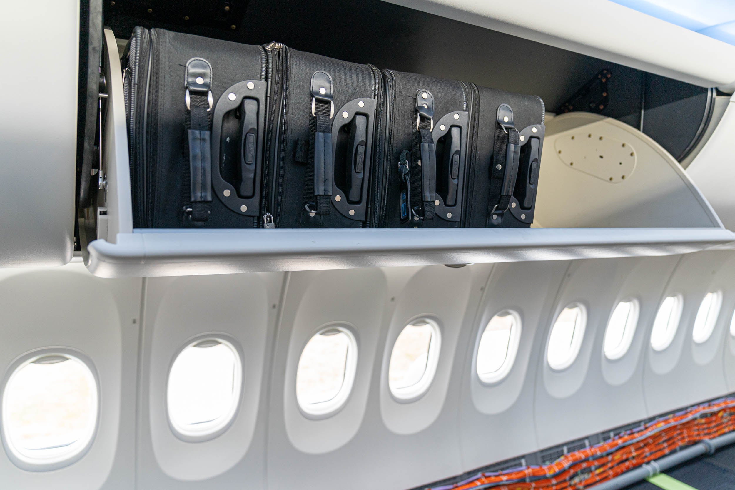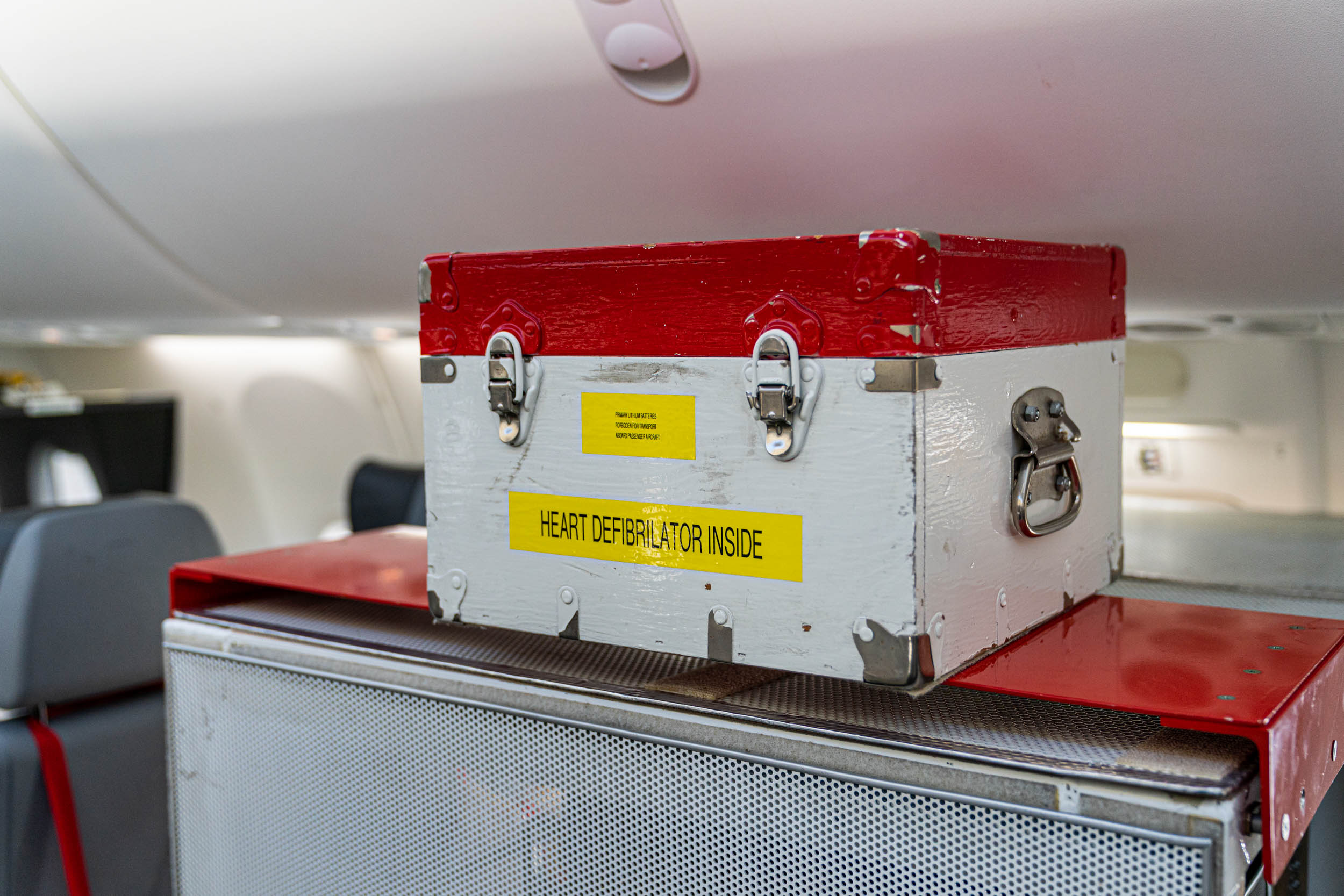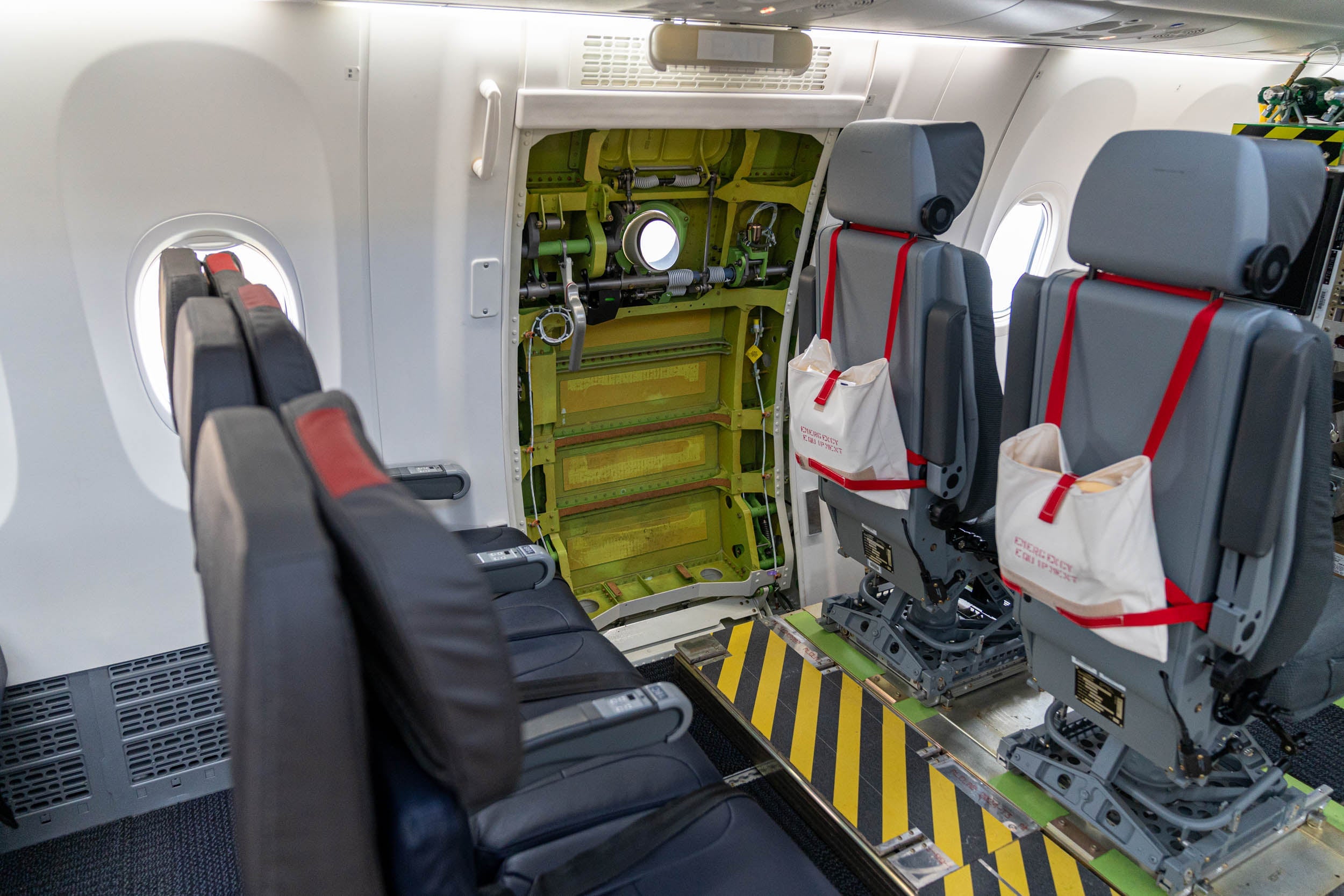 Even though it isn't an in-service commercial jet yet, Boeing must carry certain emergency equipment for the employees on board. There are oxygen tanks, a defibrillator, and a fire suppression blanket that were sitting in plain sight, and each seat had a life vest in case of an emergency water landing.