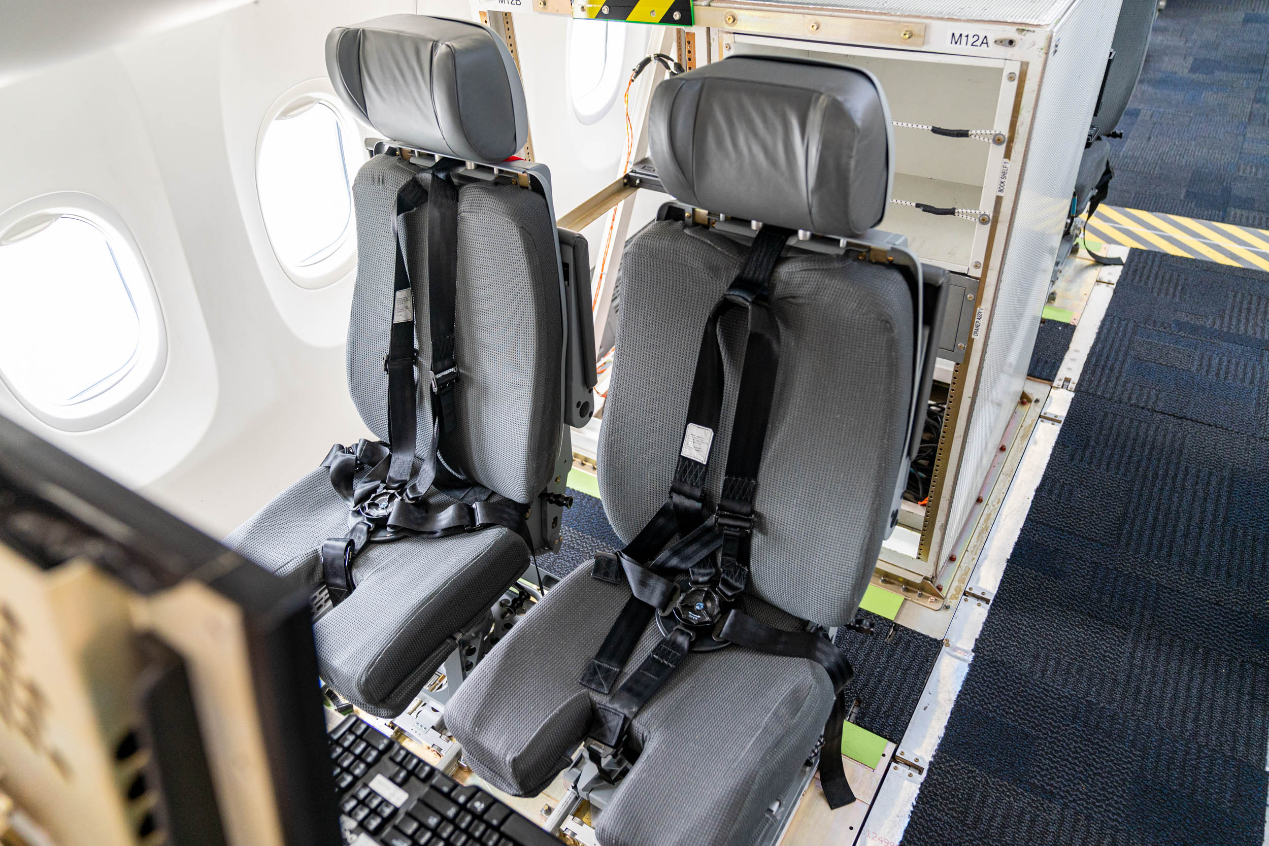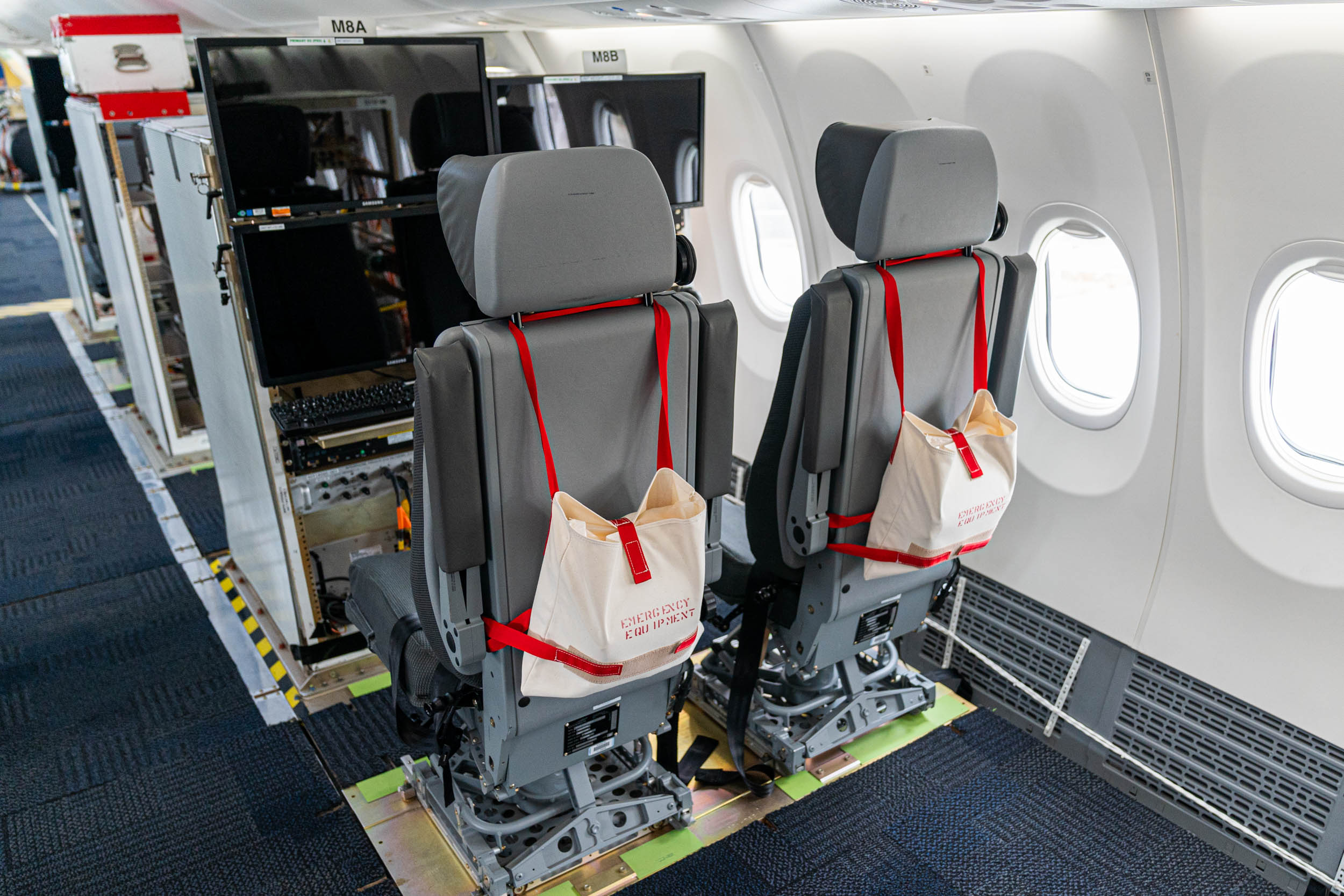 Each of the test seats has a more substantial harness than the seatbelt that commercial passengers wear because some of the test maneuvers can be a bit extreme, with the planemaker proving exactly what the plane can handle. There life vests are strapped to the back of each seat.