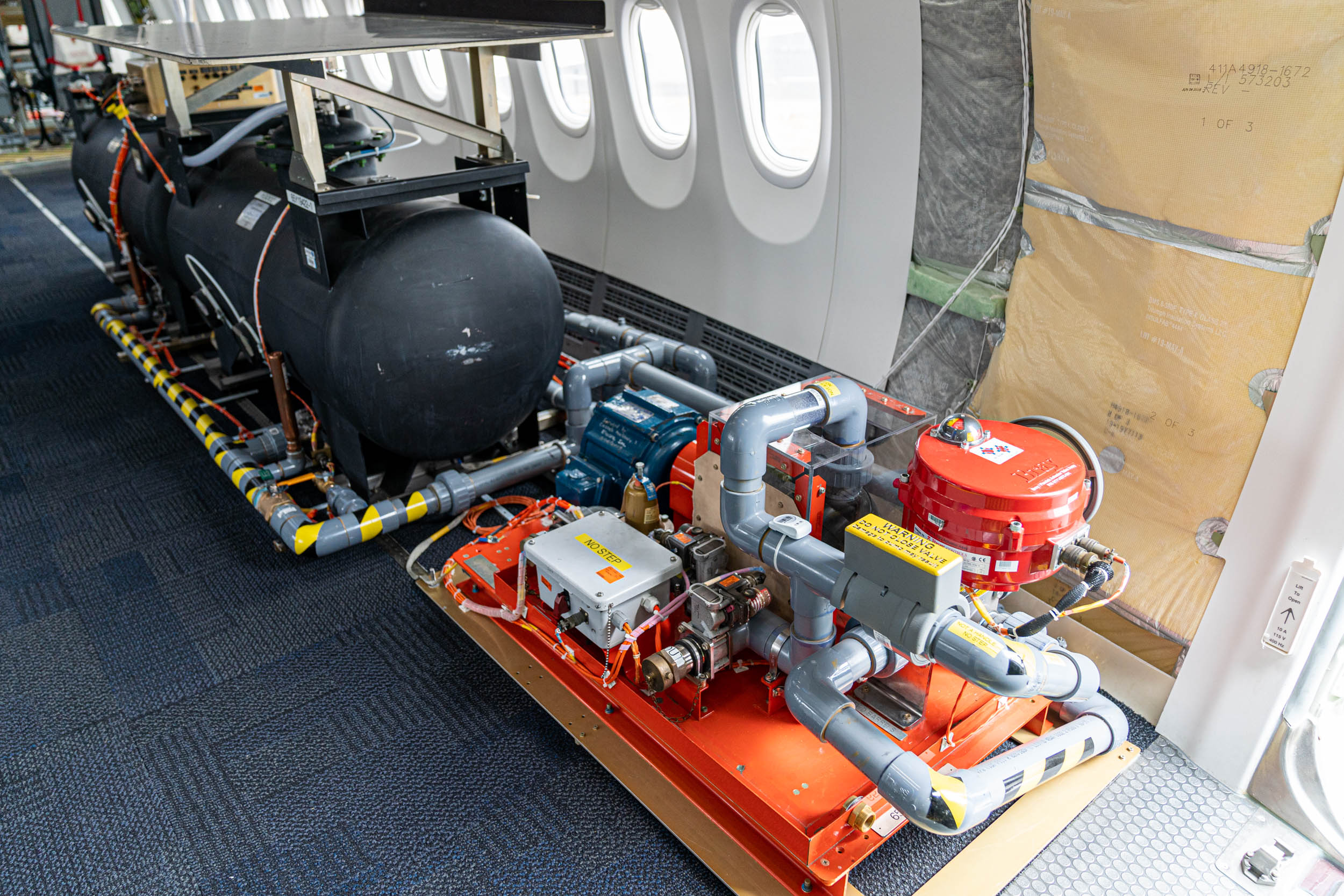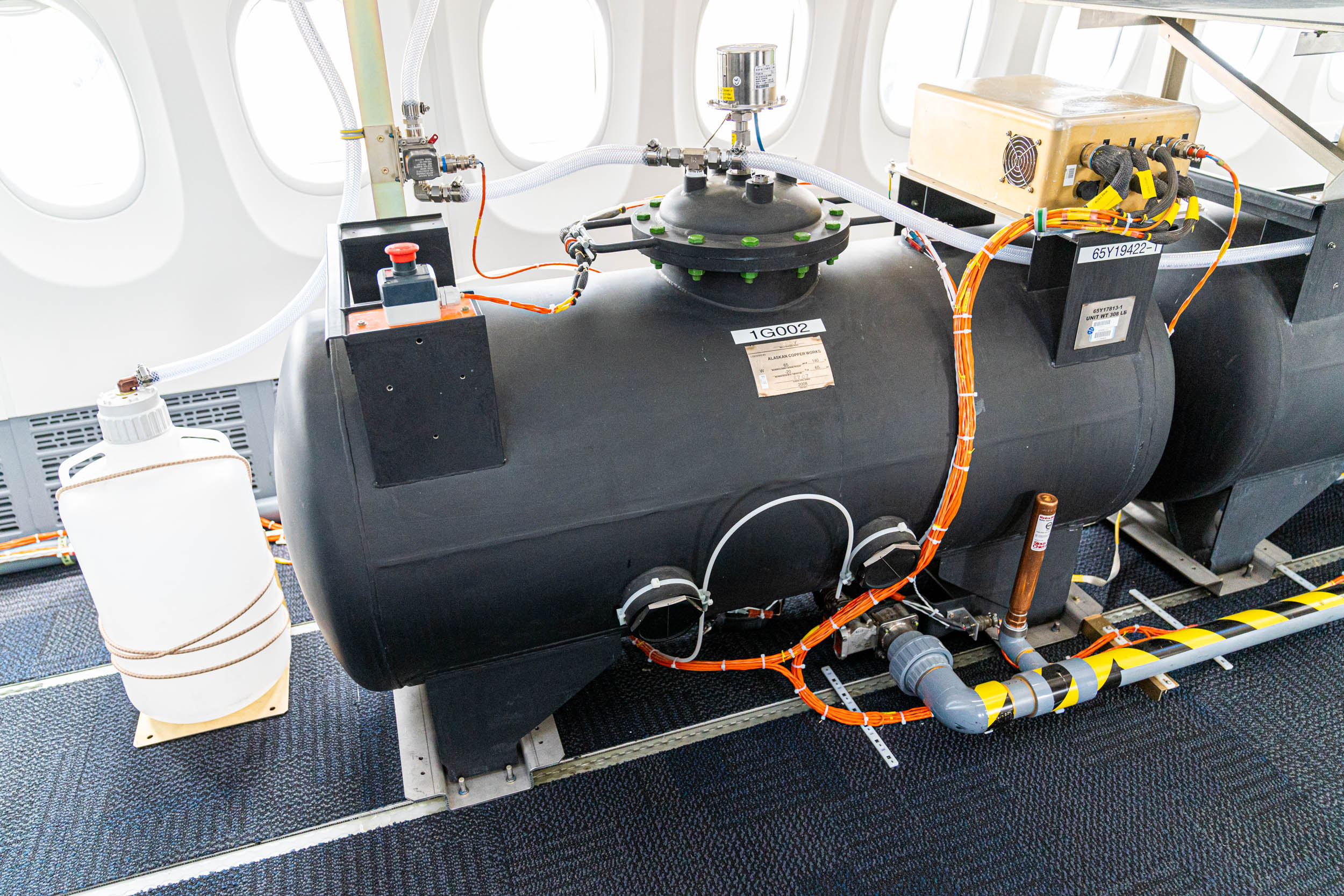 In the space that's not taken up by passenger seats, there are all kinds of different testing equipment. A central plumbing system connects several water tanks, and a pump lets test engineers move that water around from tank to tank to redistribute weight for balance testing.
