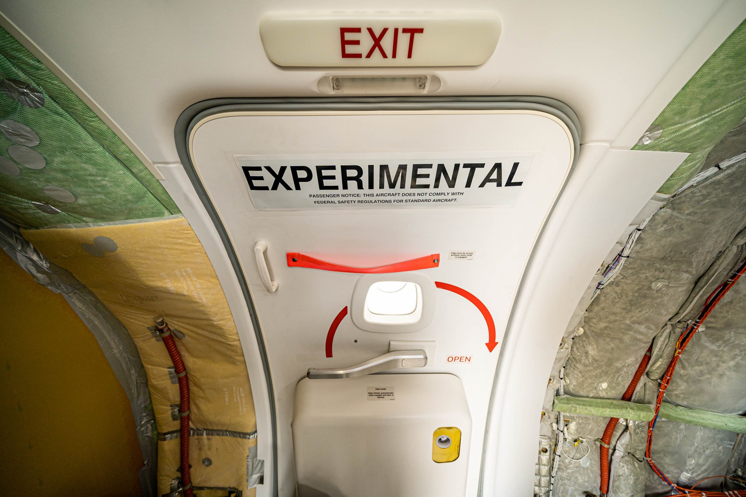 As you walk about the jet, you'll see the word "experimental" written in big letters at every door and on the outside of the boarding door. This is to remind you that this is not a commercial airliner, and it's not fully up to spec just yet.