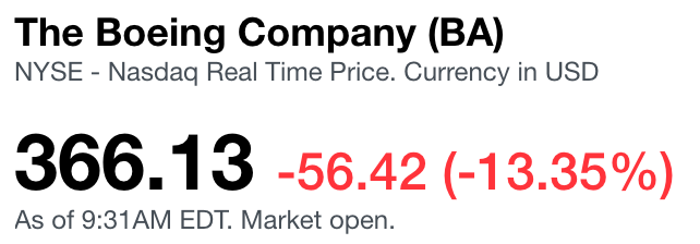 Just after the market opened, $BA fell to around $366 a share, representing a drop of just over 13% from its Friday close.