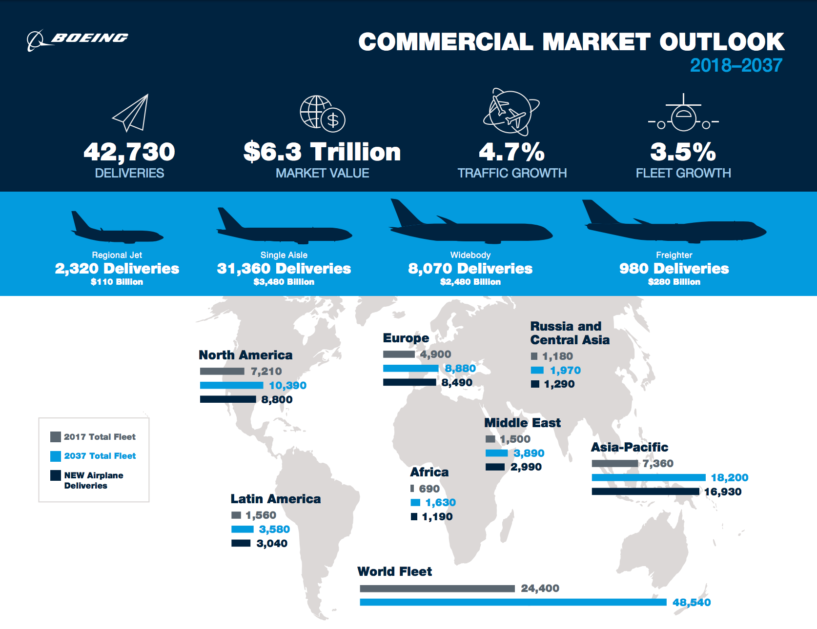 Most of these planes will be single-aisle aircraft, purchased for emerging markets such as Asia-Pacific and India. Boeing now predicts demand for 31,360 single-aisle planes, an increase of 6.1% over the 2017 forecast.