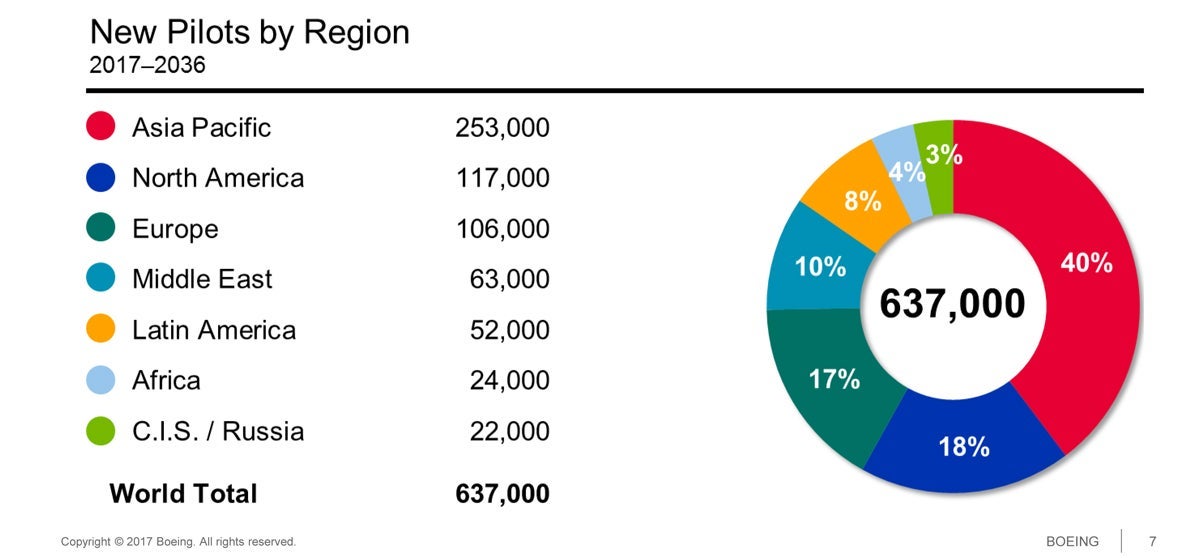 Boeing said the commercial aviation industry will need 637,000 new airline pilots worldwide between now and 2036. That boils down to just over 87 pilots a day, or almost four pilots every hour. The rapidly growing Asia-Pacific region accounts for 40% of the need, with 253,000 pilots needed. North America needs less than half of that, at 117,000, followed by 106,000 in Europe, 63,000 in the Middle East, 52,000 in Latin America, 24,000 in Africa and 22,000 in CIS (Commonwealth of Independent States)/Russia.