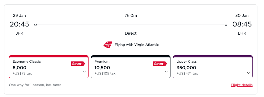According to our December 2024 valuations, TPG values Virgin points at 1.4 cents each, making those 4,000 bonus points worth $56. While that might not seem huge, Saver fares to London now start from just 6,000 points plus fees, taxes and surcharges of just $73.