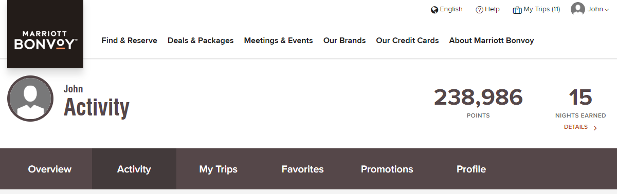 To see if your 2020 elite night credits have posted, head to Marriott's website, log into your account, click your name at the top right corner of the page and then select Activity. Or, you can click this link to log into your Marriott account Activity page. If you have a qualifying credit card, your "nights earned" will hopefully be (at least) 15.