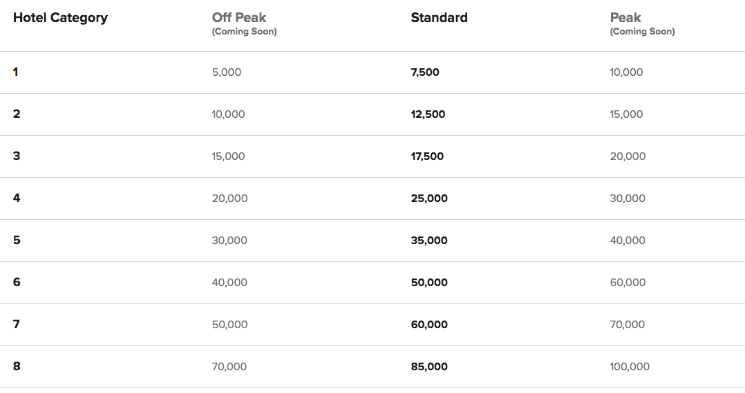 While the spread is even for points redemptions with the regular chart, the structure doesn't make quite as much sense here. For example, for Category 2 hotels, you'll save 2,000 points on off-peak dates but pay only 1,000 more on peak dates, compared with the standard rate. With Category 7 hotels, you'll save just 5,000 points on off-peak dates, while peak dates will require 10,000 more.