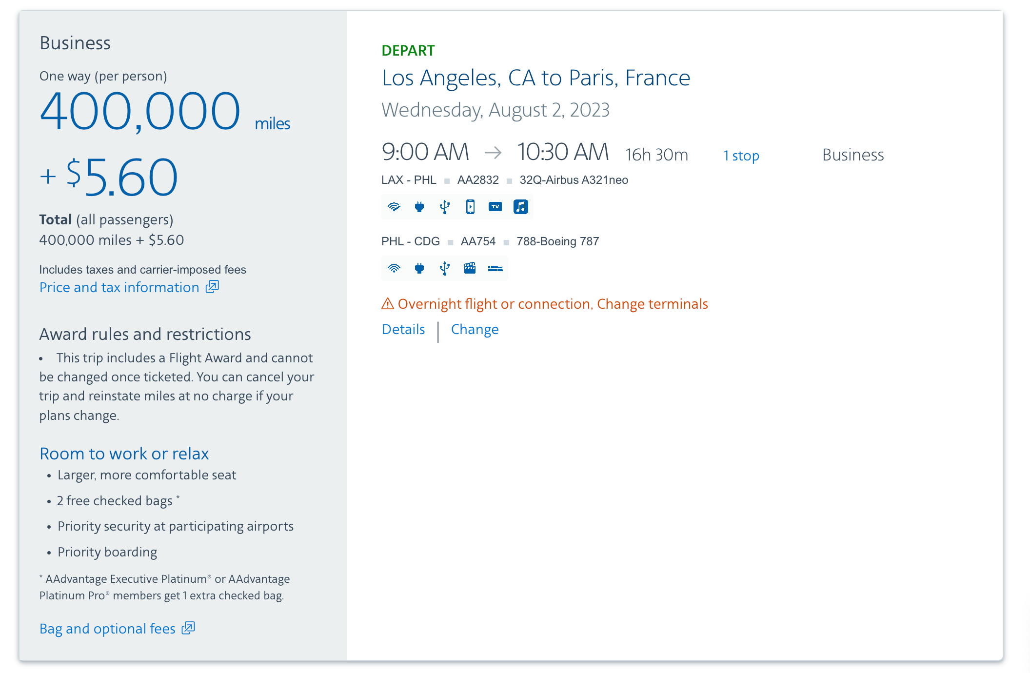 However, if you are looking to fly during busy periods to popular destinations, like Europe during the summer, prepare for a pricing shock, with one-way, premium-cabin flights priced at several hundred thousand AAdvantage miles per person.