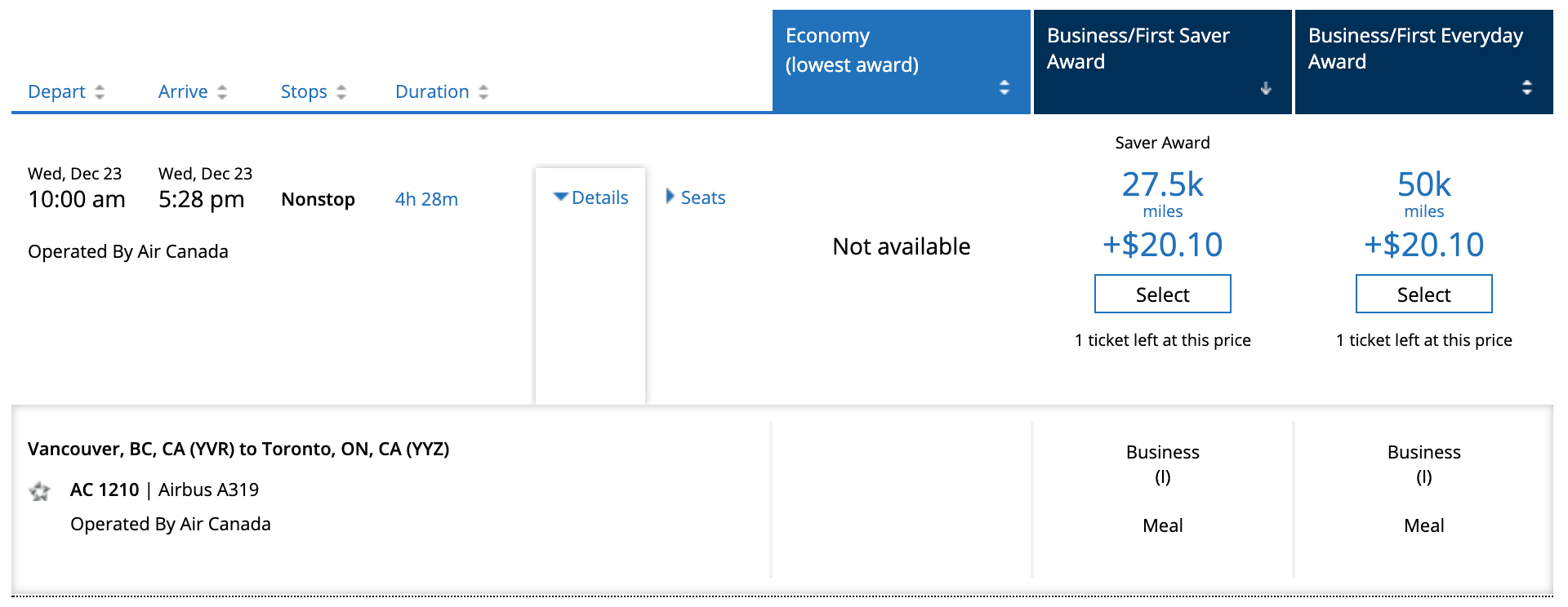Some flights are also available to book through Air Canada's Aeroplan program, with redemptions starting at 25,000 miles each way.