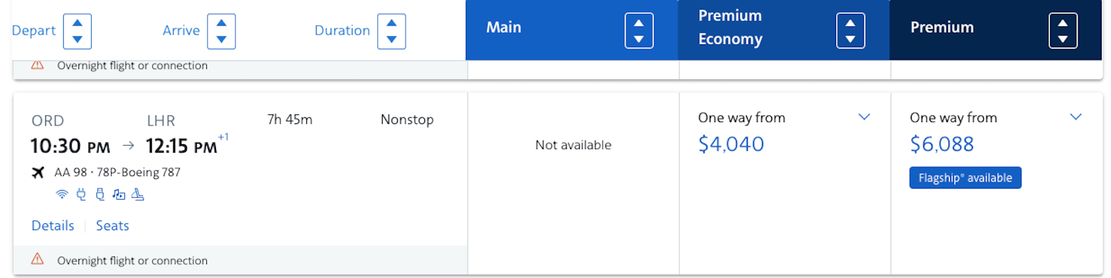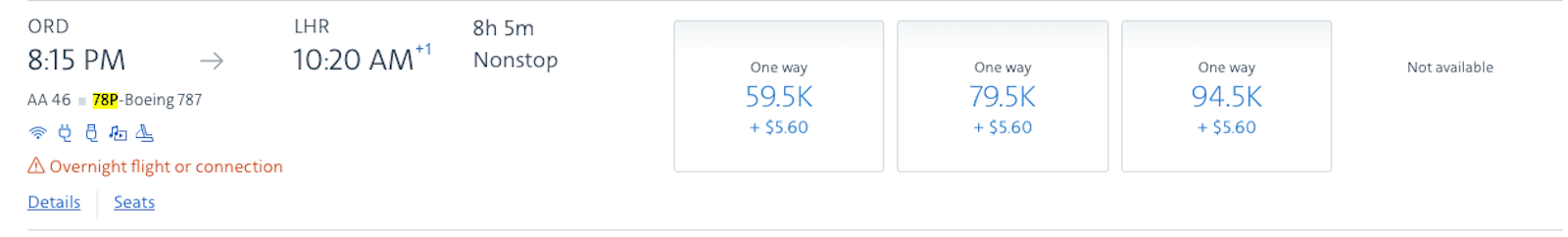 In American's booking channels, look for flights that say "78P," like in this example for an ORD-LHR flight for July 18.