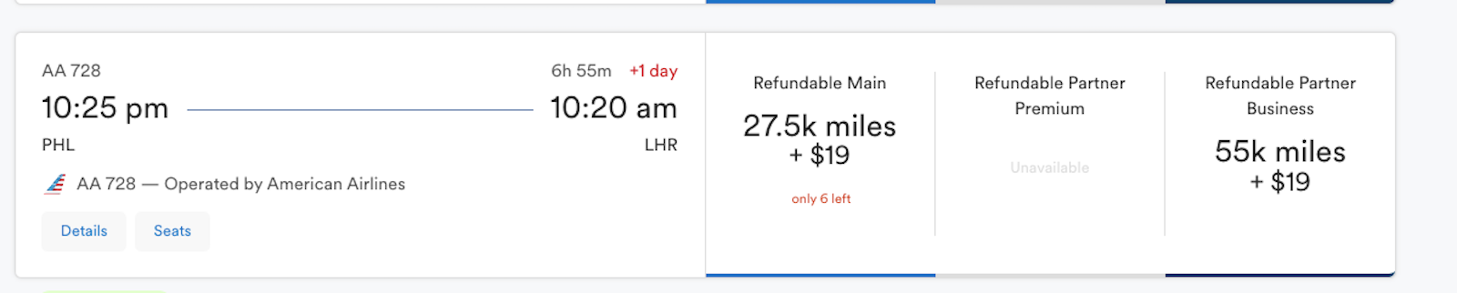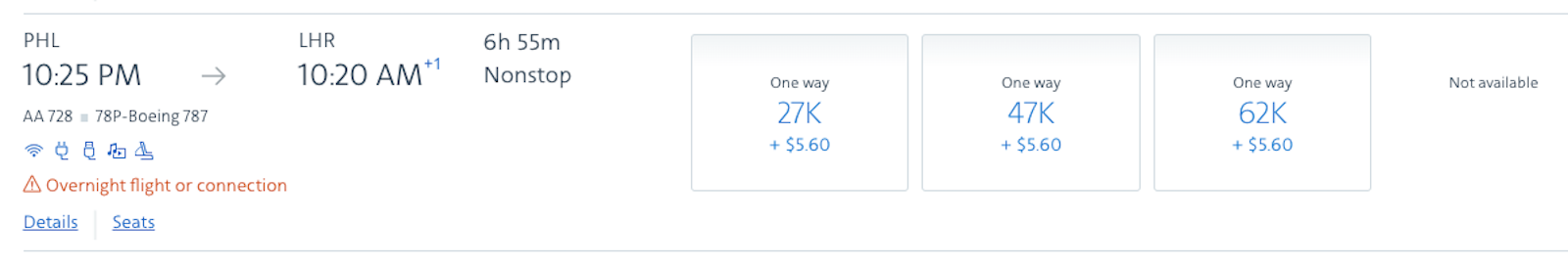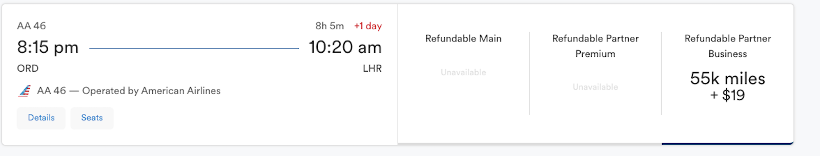 Note that premium economy tickets for 47,000 American miles is a really good award deal, giving you a value of about 8.6 cents per mile. However, you may want to hold off on booking those premium economy seats when you can book a luxurious business-class seat for just a few more miles.