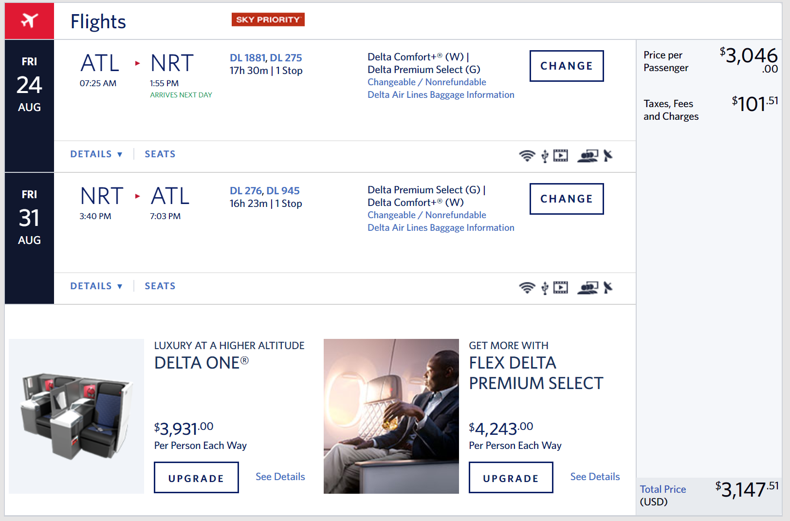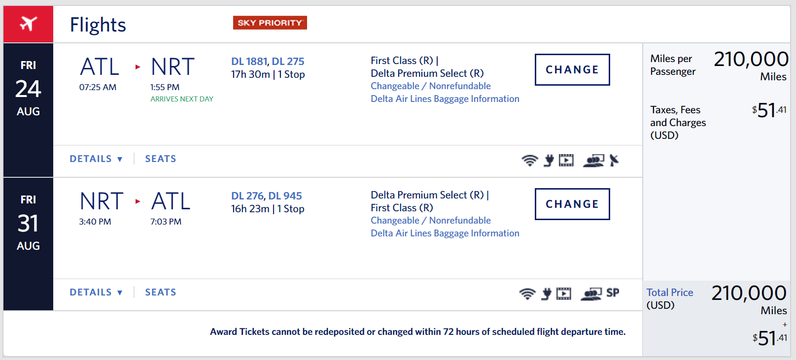 Despite this change to revenue flights, Premium Select award tickets are continuing to book into first class on the domestic legs. For example, here are the same flights booked with SkyMiles, which are still getting domestic legs booking into first class: