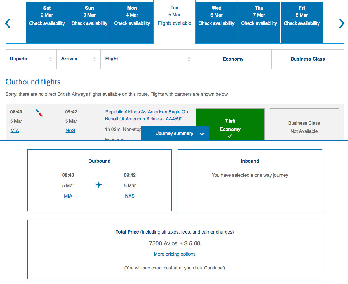 Miami or Charlotte-based travelers can redeem just 7,500 British Airways Avios each way for a nonstop American Airlines operated flights between Miami (MIA) and NAS on American Airlines. Chicago-based travelers can fly for 10,000 British Airways Avios each way on American. Here's how to redeem British Airways Avios on American Airlines flights. You can transfer Chase Ultimate Rewards and Amex Membership Rewards points to British Airways Avios.