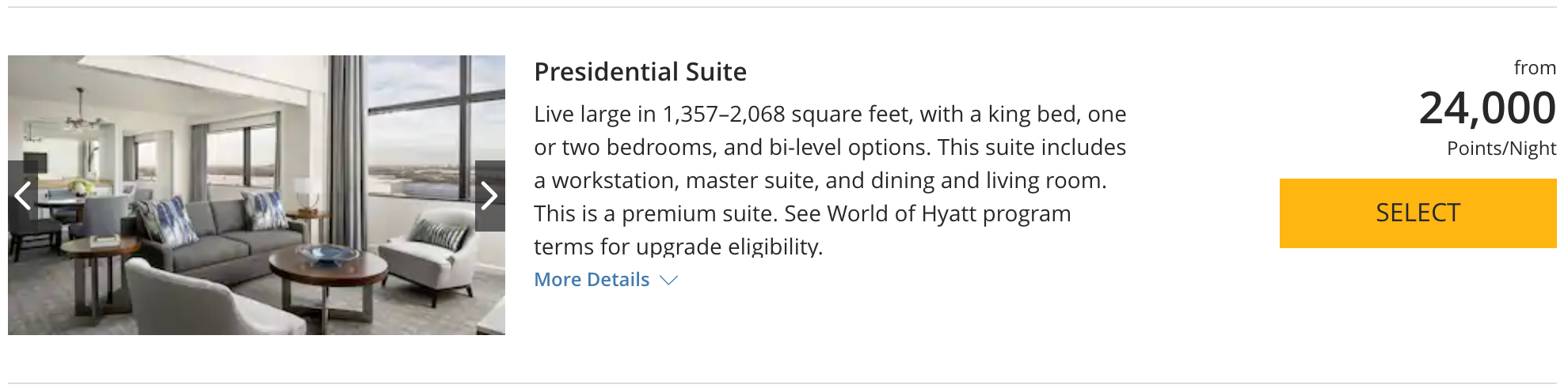 Depending on the property and availability, you may be able to redeem your points for a presidential suite and get outsized value out of your points. On a sample search, I found a presidential suite available at the Hyatt Regency Orlando for 24,000 points for a random night in February. The cash rate for members is a whopping $11,671 (including taxes and fees), yielding an astonishing value of 48.63 cents per point, nearly 29 times TPG's most recent valuations.