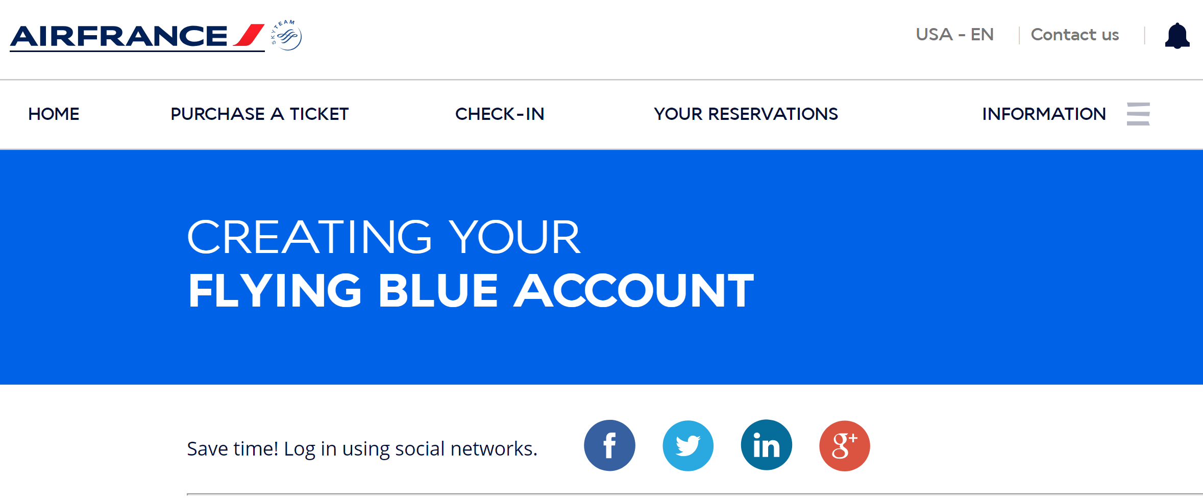 Next, in order to even search availability, you're going to need a Flying Blue account. If you don't have one, start here. You can sign in via a social media account (Facebook, Twitter, LinkedIn, Google+) if you don't want to have to keep track of another log-in.