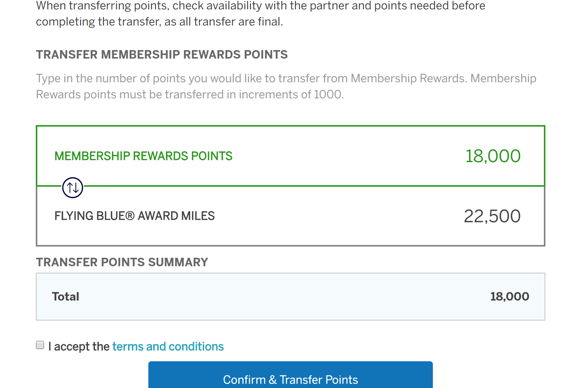 Remember you must transfer points in increments of 1,000 Membership Rewards points. So, make sure you calculate the right number of points to transfer. And, make sure to agree to the terms and conditions before clicking "Confirm & Transfer Points." According to TPG testing, Membership Rewards transfer to Flying Blue immediately. So, you should be able to move right into the next step.