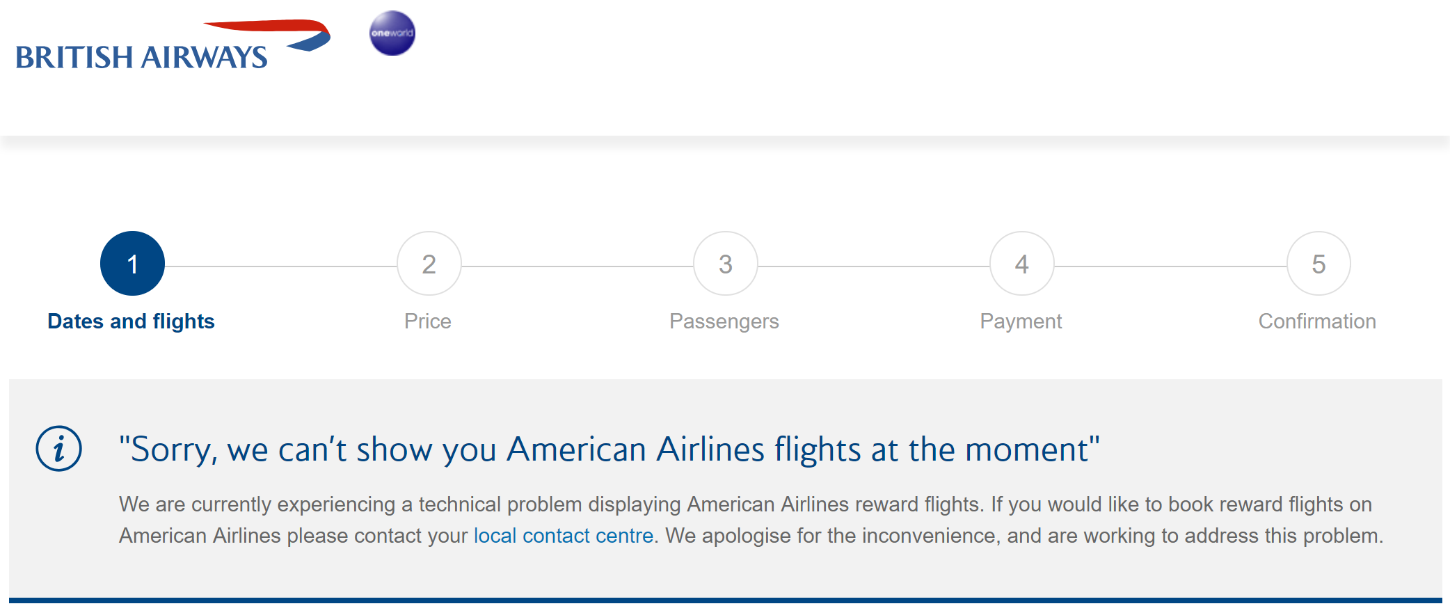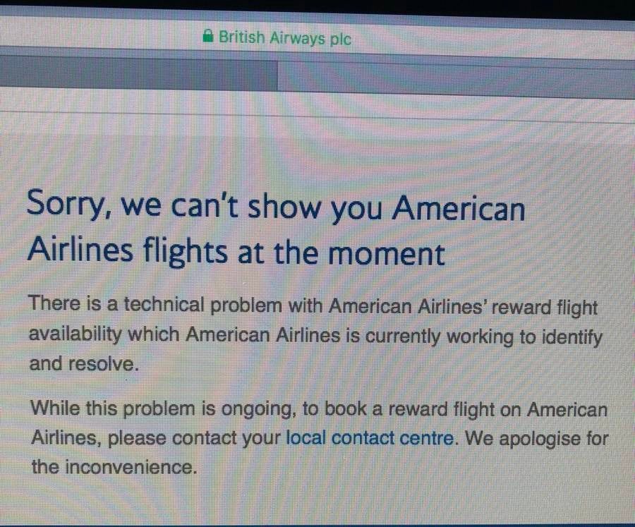 On May 22, British Airways added a warning to the top of its award search page alerting travelers of "a technical problem with American Airlines' reward flight availability which American Airlines is currently working to identify and resolve."