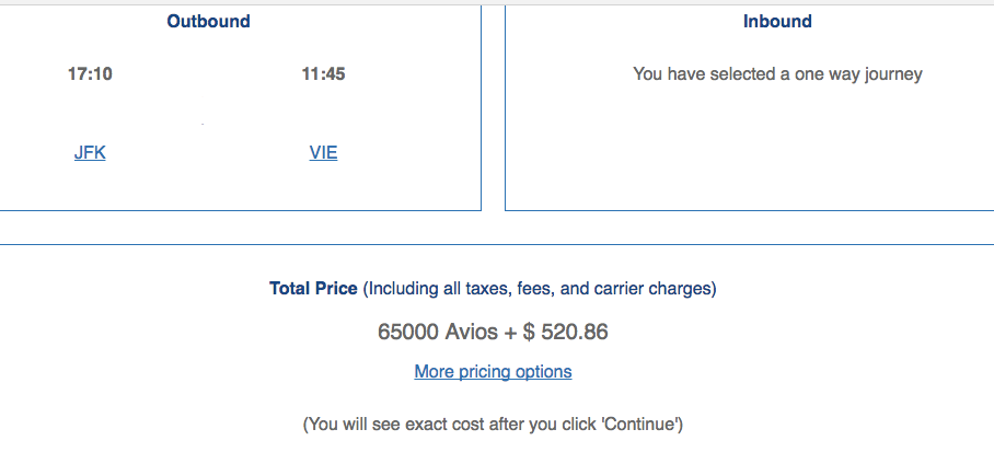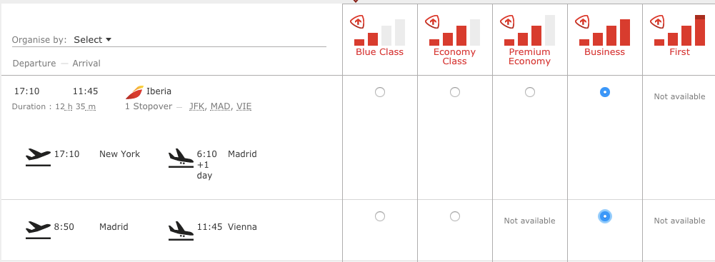 Iberia did indeed have two business award seats on our preferred date from JFK to Madrid and then on to Vienna. I had transferred some American Express Membership Reward points to British Airways during a 40% transfer bonus and so just moved those points instantly to Iberia to book two awards at a cost of 65,000 Avios and $113 each. Factoring a 40% transfer bonus, that is essentially the same as spending about 47,000 Membership Reward points and $113 to fly business class to Europe.