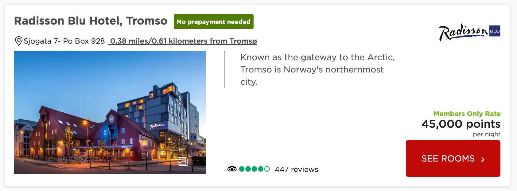 Hotel options with points include the Radisson Blu Hotel Tromsø and a handful of inexpensive options from Choice Privileges. Warning: Cash prices during the winter holidays will be very high, so use points if at all possible.