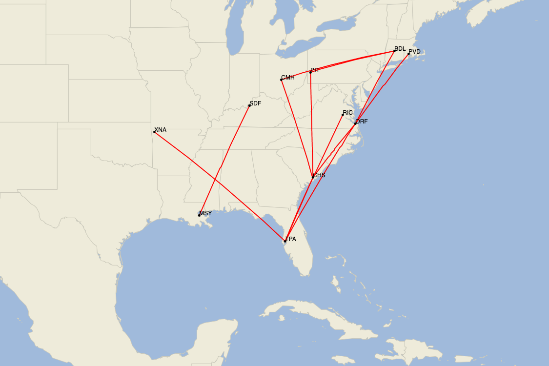 The carrier started with 39 routes between 16 midsized markets, focused on cities that the airline calculated are too small for major carriers to serve beyond flights to their hubs.