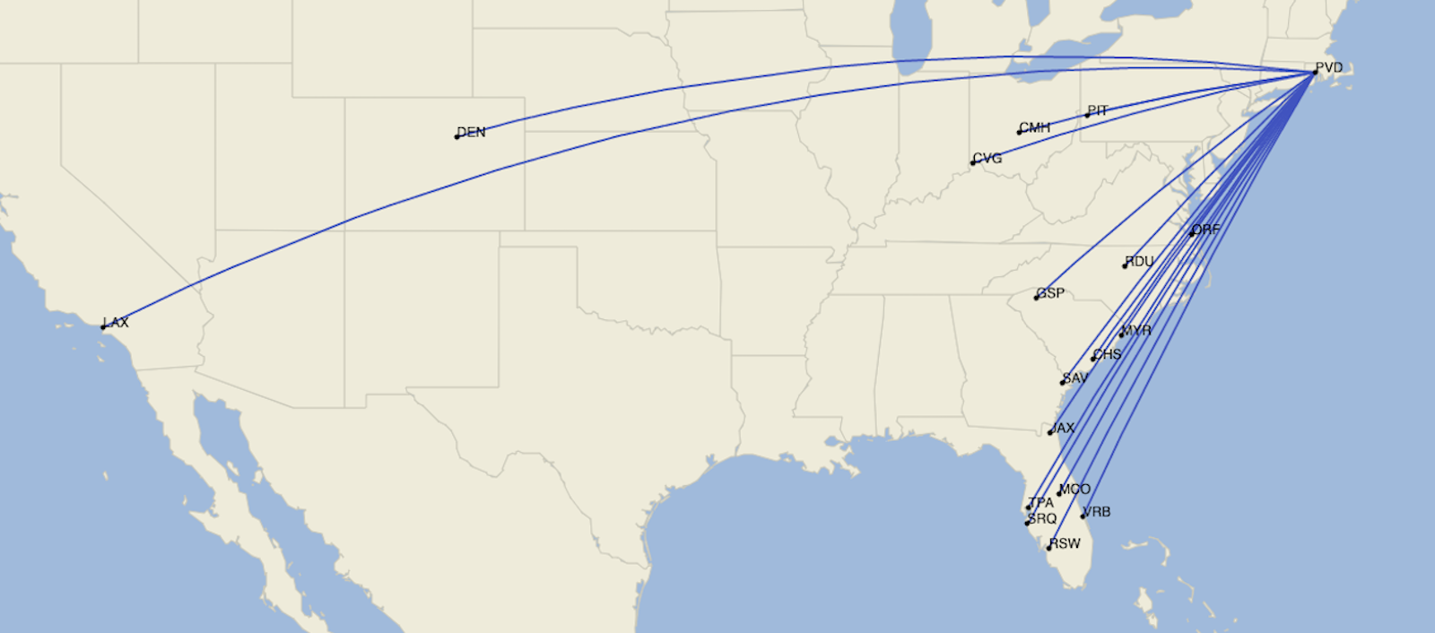 Here's how Breeze's current Providence route map shakes out, as shown by aviation analytics firm Cirium.