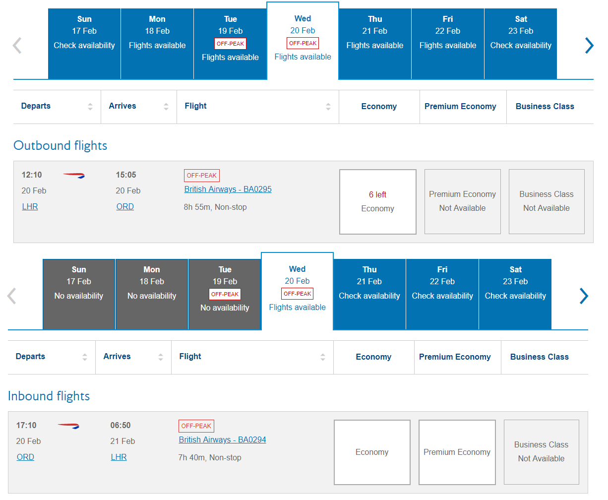 - BA 295 LHR-ORD: 6 economy, no premium economy, no business class, no first class