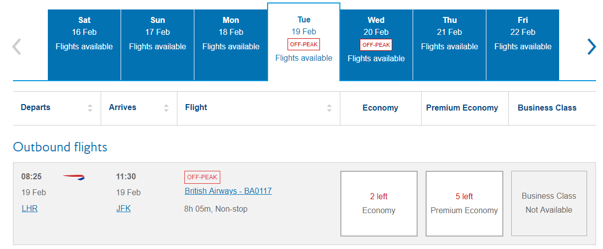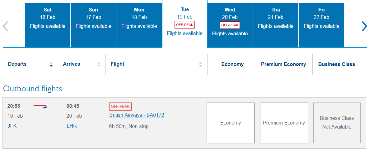 The great news for points and miles collectors is that these flights are available on miles. British Airways flight 117 from London Heathrow (LHR) to New York Kennedy (JFK) has economy and premium economy award availability. Unfortunately, there's neither business class nor first class award availability on the flight.