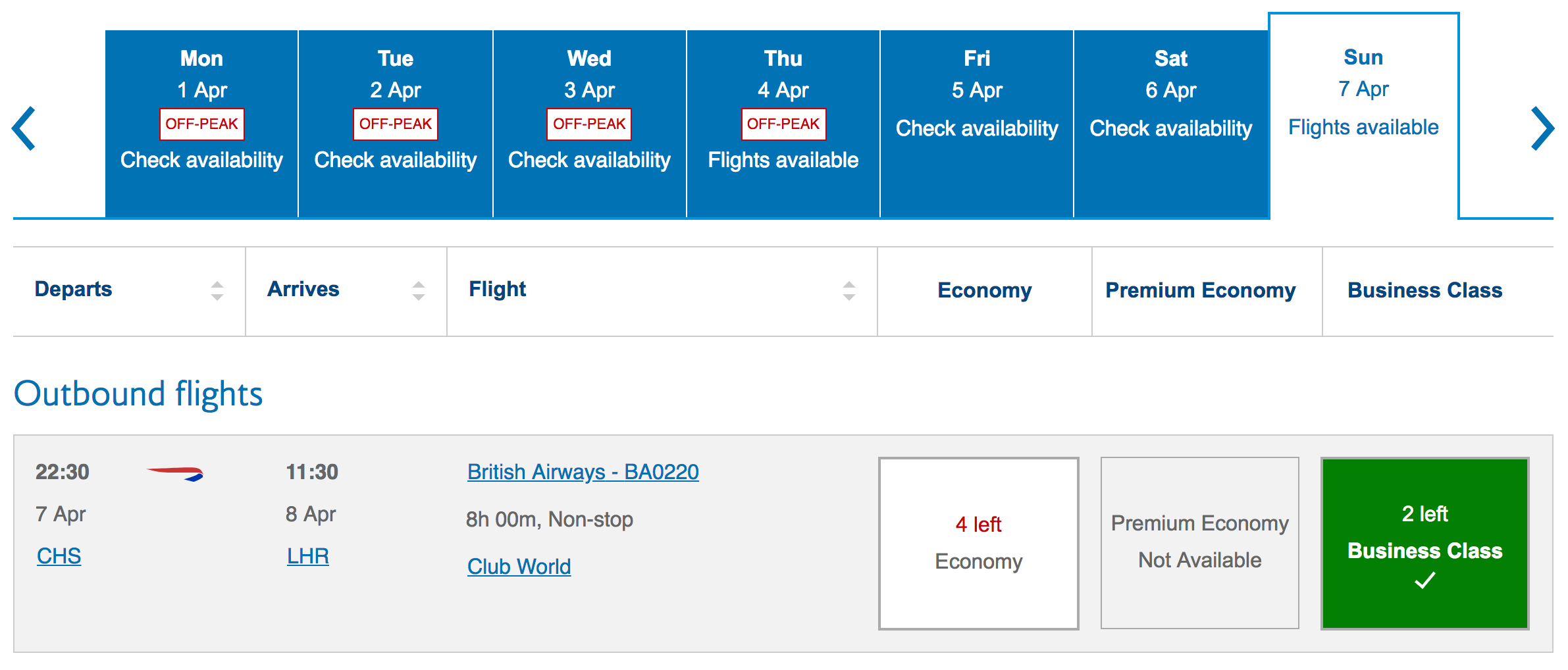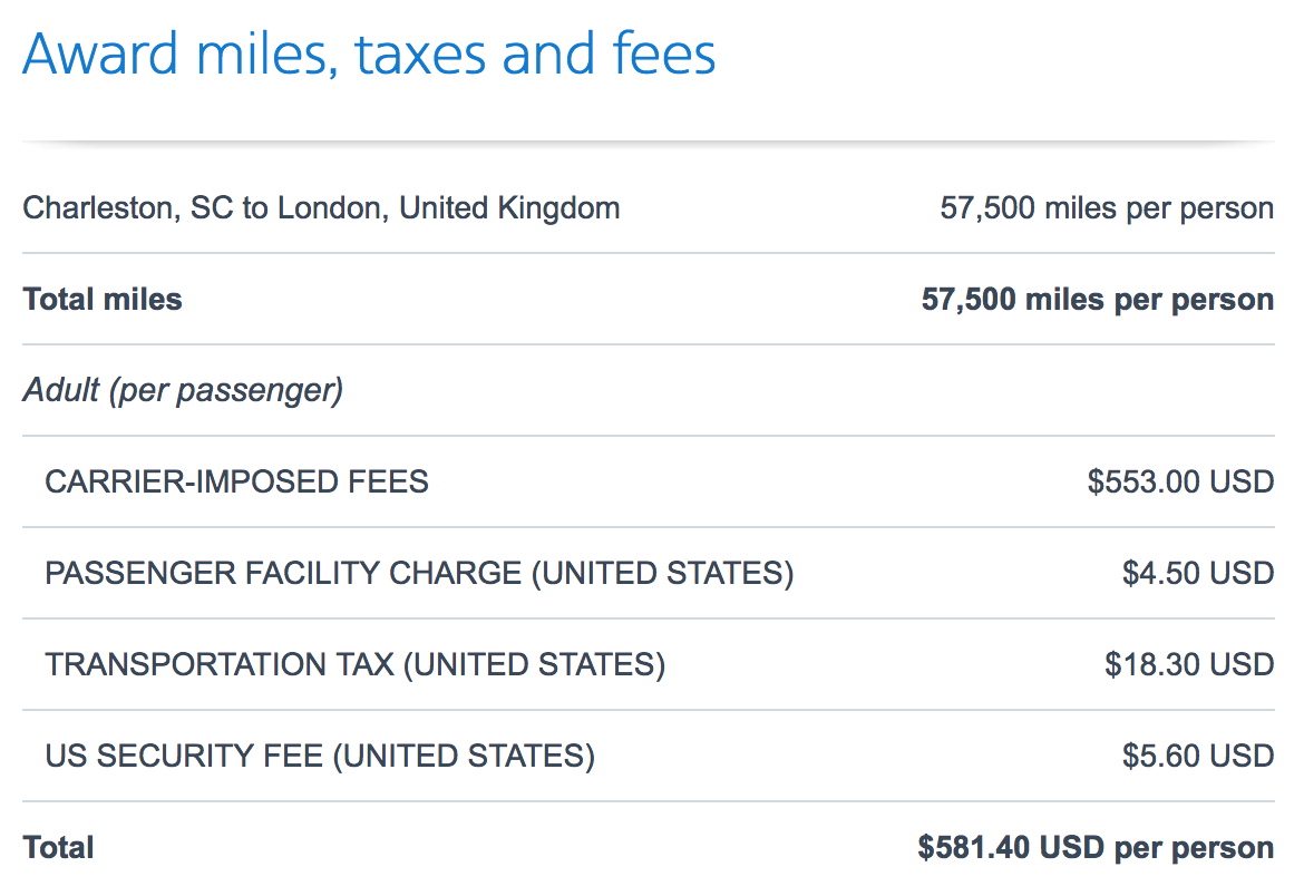 Surcharges are ridiculously high, however. Including tax, you're looking at $213 (economy) or $581 (business) on flights from Charleston, or $331 (economy) or $551 (business) on flights from London — on a round-trip business-class award ticket, you could end up paying an absolutely absurd $1,132 in taxes and fees.