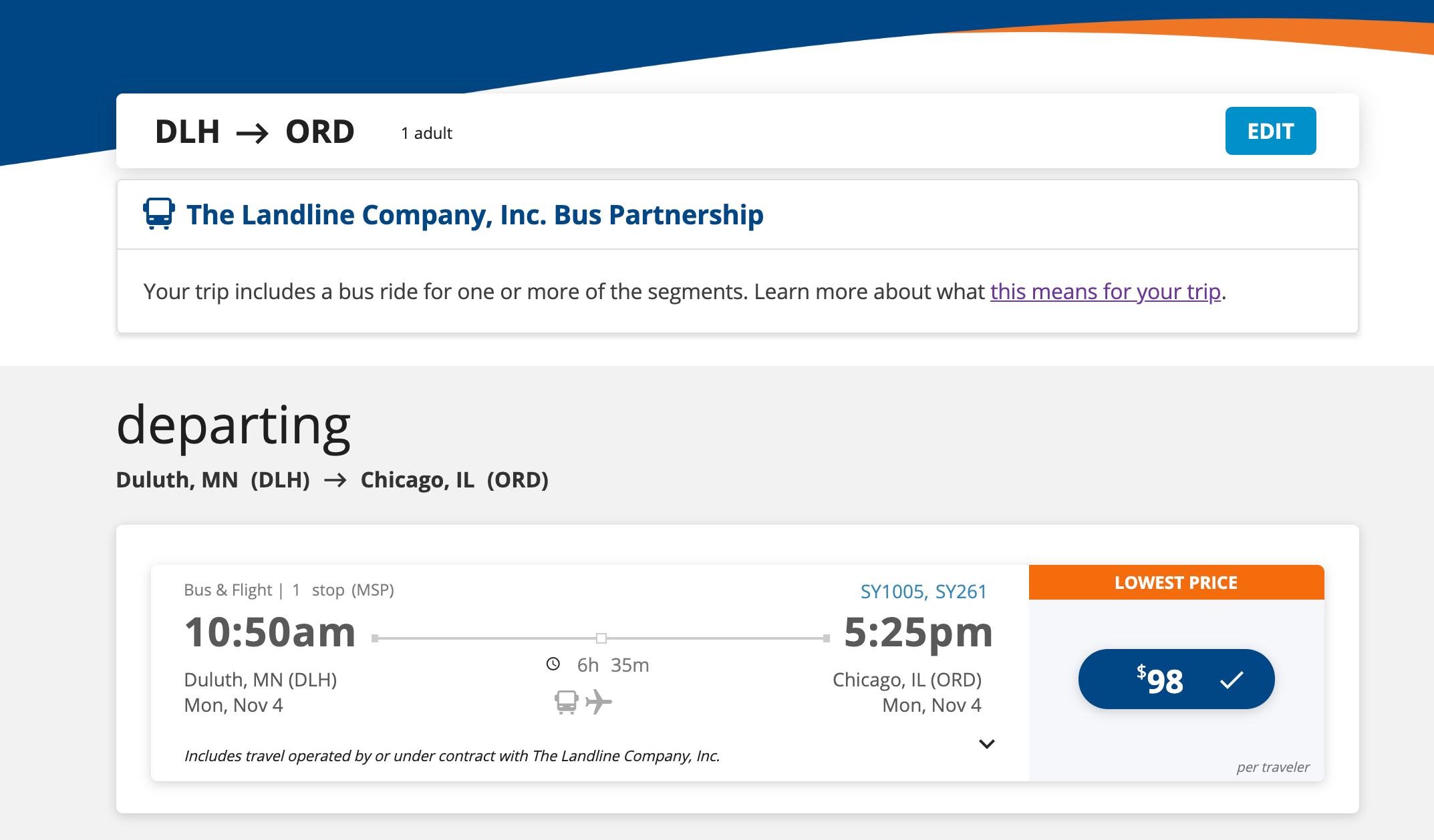 Booking a ride via Sun Country is the same as booking a flight. Duluth and Mankato are listed among origins and destinations on its website, and sold as a straight-forward connecting itinerary with a notice that one leg is on a bus.