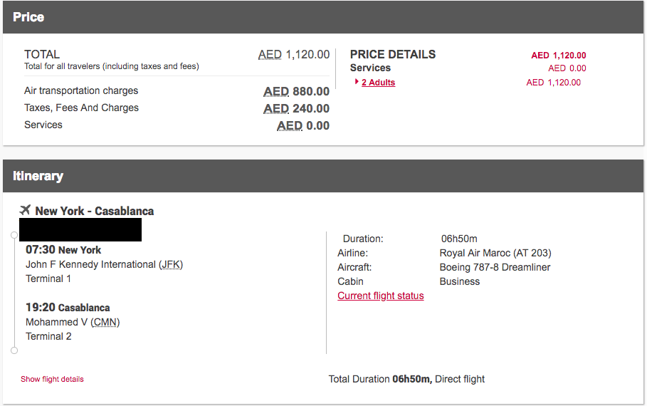 There's no way to check award availability online for the two daily (every day of the week except Monday) flights from JFK. You'll have to call the Etihad Guest phone center (1-877-690-0767), which is rarely a pleasant experience — and it's particularly time-consuming when the agents need to check space. They'll have to put you on hold while they find the flight and then manually query Royal Air Maroc for award space. They then build a reservation in order to quote the miles you need and taxes and fees.