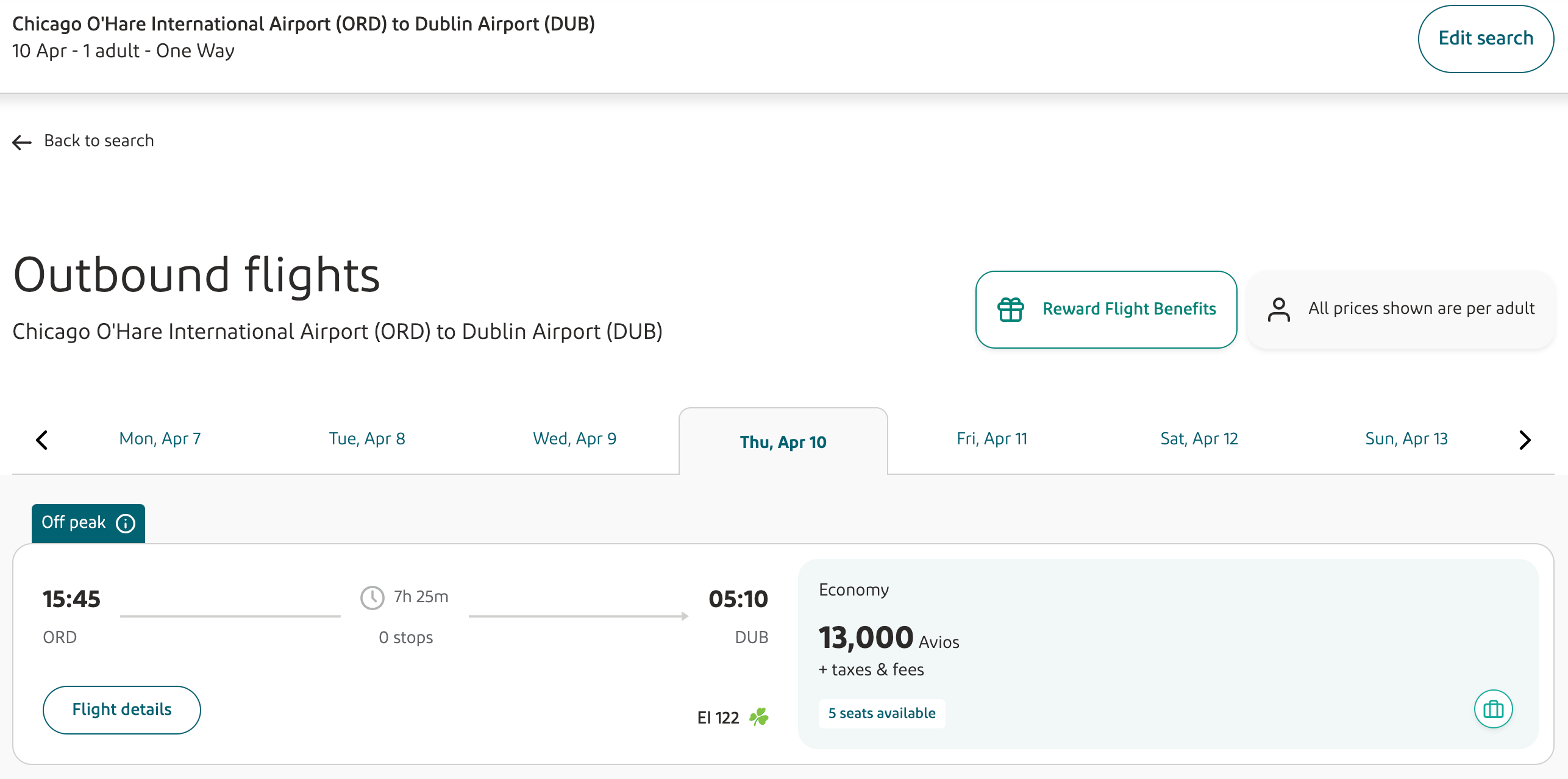 There's also plenty of award availability to Ireland if you transfer your Avios to Aer Lingus AerClub. For instance, you could fly to Dublin from several major U.S. cities, including Chicago, for only 13,000 Avios. With the current promotion, purchasing the amount of Avios needed would only cost about $200 with this promotion, plus the award ticket's $126 in taxes and fees, for a total of $326. This is a great deal for a transatlantic flight, as the regular cash price of this economy ticket would cost you almost $800.