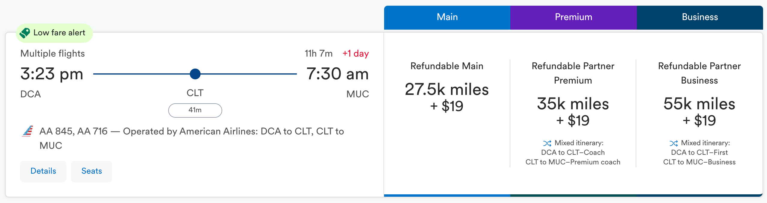 Or you could fly American Airlines in March in a combination of first and business class from Washington, D.C., to Munich for 55,000 miles plus $19. If you were to book this flight route, it would cost you almost $6,000; however, if you buy 55,000 miles, it will only cost you about $711. That is a great deal on a transatlantic business-class flight!